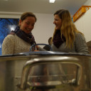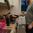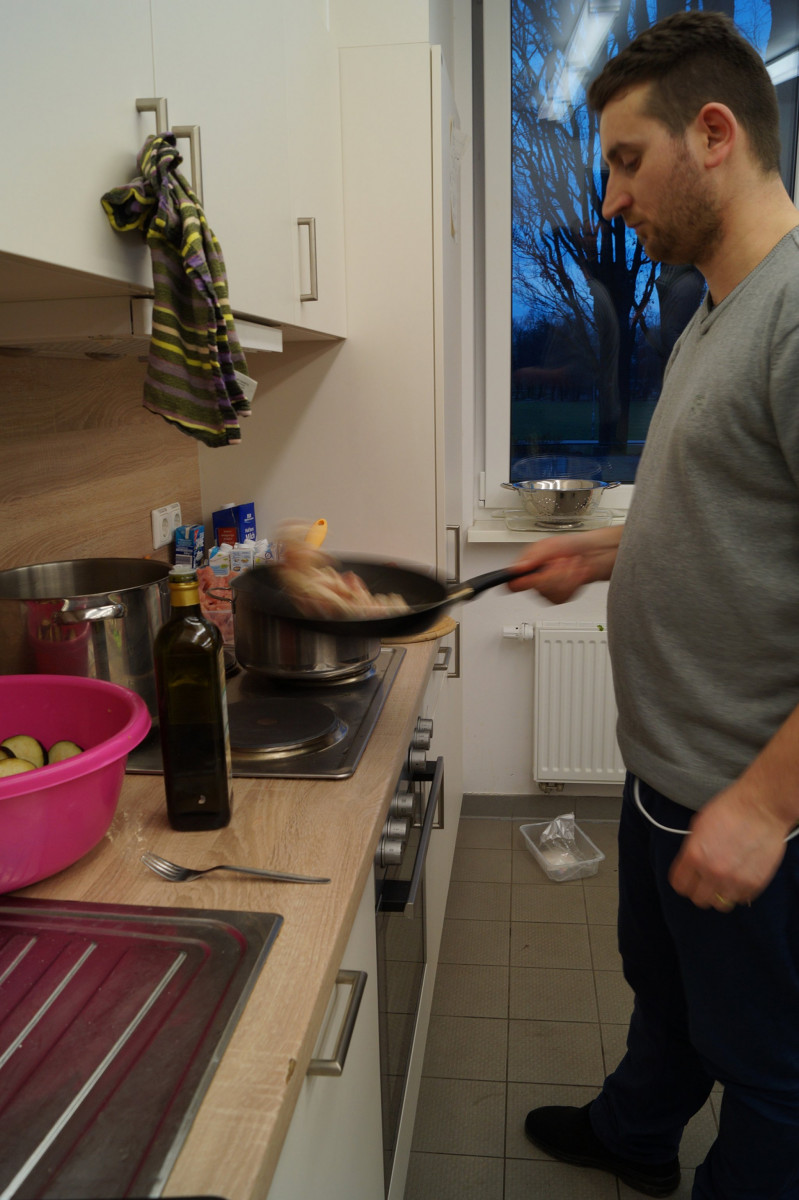 Am Freitag, dem 26.02.2016 duftete es, untermalt von würzigen Klängen, aus der Schülerküche der SteinMalEins und UniverSaale im Paradies. Zu unserem vierten Kochabend „Bunte Töpfe“ fanden sich etwa 50 interessierte fleißige Gäste verschiedener Herkunft ein – die Hälfte von ihnen Geflüchtete aus dem Irak, Iran, Afghanistan, Syrien und dem Kosovo und die andere Hälfte Jenaer_innen. Nach all den bisherigen sehr gefragten und dementsprechend sehr gut besuchten kulinarischen Abenden mit diversen Köstlichkeiten aus syrischer und afghanischer Küche, war unser vierter Kochabend kosovarisch inspiriert. Ein gelernter Koch aus dem Kosovo nahm uns mit auf eine kleine kulinarische (Welt)Reise in den Kosovo. Entsprechend schwungvoll und professionell wurde auch die Pfanne geschwungen. Wir danken dem kleinen Kochteam aus dem Kosovo, welches nach drei Abenden nun so viel Vertrauen gefasst hatte, um auch mal die Regie in unserer Küche zu übernehmen. Es bestätigte sich abermals unsere Erfahrung, dass Menschen egal welcher Herkunft, sobald sie aus der Nehmerrolle wieder in die Geberrolle wechseln dürfen regelrecht aufblühen. Gemeinsam wurde ein Reisgericht gezaubert mit Auberginen, Zucchini, Fleisch und einer Champignonrahmsauce. Dazu wurden viele, viele Eisbergsalate geschnippelt, Möhren und Gurken gestiftelt, ein Berg Zwiebeln und Tomaten geschnitten und all das frische Gemüse zu zwei leckeren Salate angerichtet.