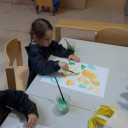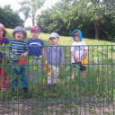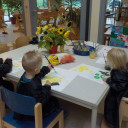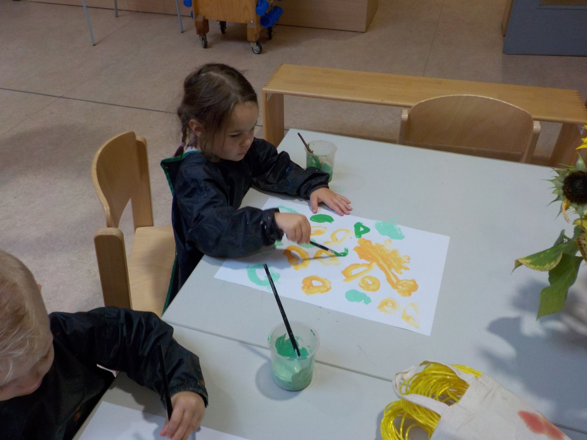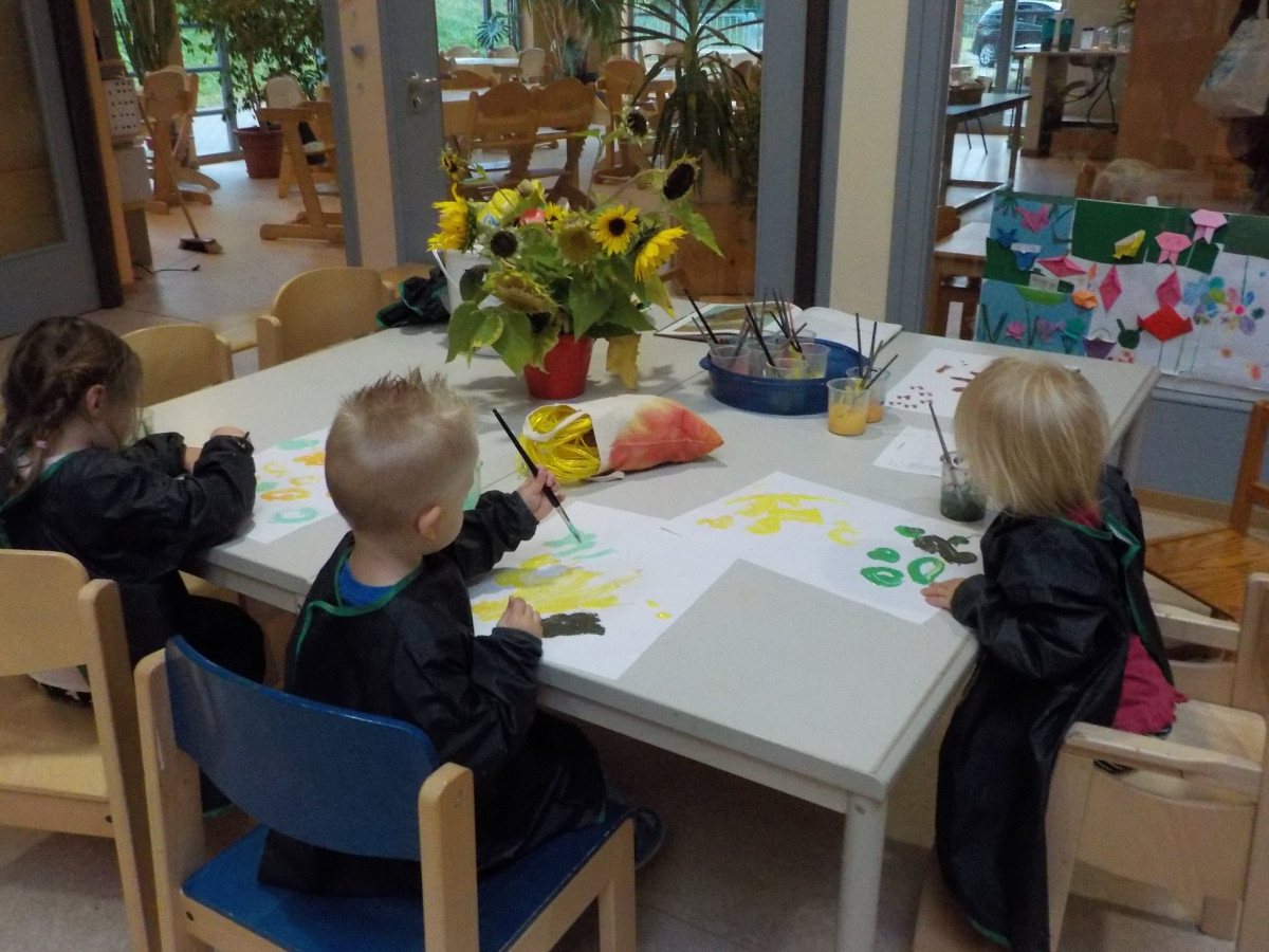 Im April sind einige unserer Kinder losgezogen, um Sonnenblumensamen zu besorgen. Die Samen wurden dann vor dem Haus neben dem Zaun eingepflanzt und bald schon sprossen einige kleine grüne Pflanzen aus der Erde hervor. Während der kommenden 4 Monate wurden die Pflanzen rasch größer und die Kinder stellten reichlich Vergleiche zwischen den Pflanzen untereinander und zwischen ihrer eigenen Körpergröße und der der Pflanzen an. So konnten wir die Verwendung von groß, größer am größten und auch klein, kleiner, am kleinsten üben. Im Sommer trugen dann die ersten Blumen große gelbe Blüten und nach und nach fingen auch die anderen Pflanzen an zu blühen. Die Sonnenblumen begrüßten in unserem Vorgarten jeden, der in den Sommermonaten zu uns kam. Im September hat Ben dann die letzten Blüten gepflückt und in eine Vase gestellt. Da die Kinder bei einem Ausflug ein Buch von Vincent van Gogh ausgeliehen haben, waren sie ganz inspiriert und einige legten mit Pinsel und Farbe los, um die Blumen zu malen. So haben wir noch ganz lange Freude an ihnen.