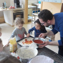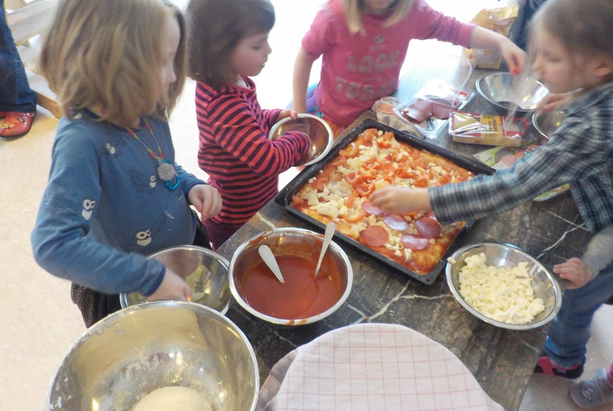 Einige Kinder hatten während der Freispielzeit im Rollenspielraum die Idee Pizza zu backen. Es gab ein Restaurant mit Pizzabäckern und Servicepersonal. Diese Idee wurde aufgegriffen und wir hatten die Möglichkeit mit einer Familie aus Italien Pizza zu backen. Eine original italienische Pizza benötigt fünf Stunden Vorbereitung und traditionelle Zutaten. Wir hatten viele Ideen wie wir eine Pizza belegen könnten und haben uns gut beraten. Eingekauft haben wir Paprika, Tomaten, Ananas, Schinken, Käse und Salami. Die Salat- und Kartoffelpizzaidee kam nicht so gut an. Wir haben Teig geknetet der dann vier Stunden ruhen musste. Nach der Mittagsruhe haben wir die Zutaten geschnitten und endlich die Pizza belegt. Am Ende hatten wir drei Pizzen die voll mit Wurst, Früchten und Gemüse belegt waren. Nach dem Nachmittagssnack konnten wir die Pizza auch probieren. Mit dem Ergebnis waren wir sehr zufrieden! Mmh lecker!