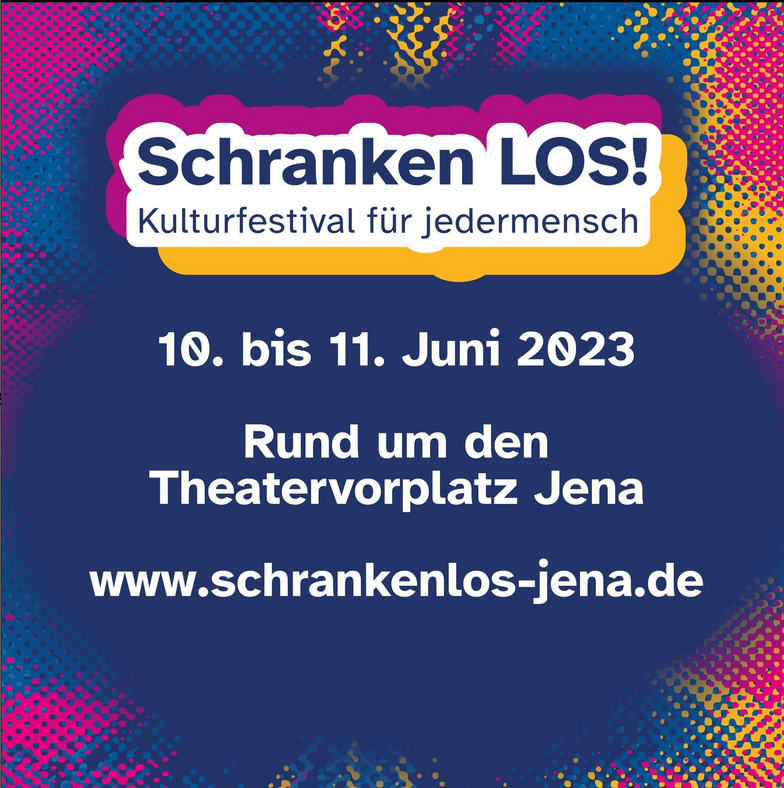 Am 10. und 11. Juni findet das erste barrierefreie Kulturfestival Jenas statt. Geboten wird ein vielfältiges Programm aus Kunst, Musik, Bewegung, Theater, Gesprächen und Kultur für jedermensch. Wir beteiligen uns am Awareness-Team des Festivals, um Assistenz und Hilfestellung für Besucher*innen zu gewährleisten, mit Bewegungsspielen und Kinderschminken am Sonntag auf dem Theatervorplatz (zwischen 14–16 Uhr) sowie einem gebärdenunterstützten Kamishibai-Theater im Schillergarten gleich nebenan (am Samstag und Sonntag zwischen 16 und 17 Uhr). Haltet einfach Ausschau nach unseren netten Kolleg*innen in QuerWege-Shirts :)
