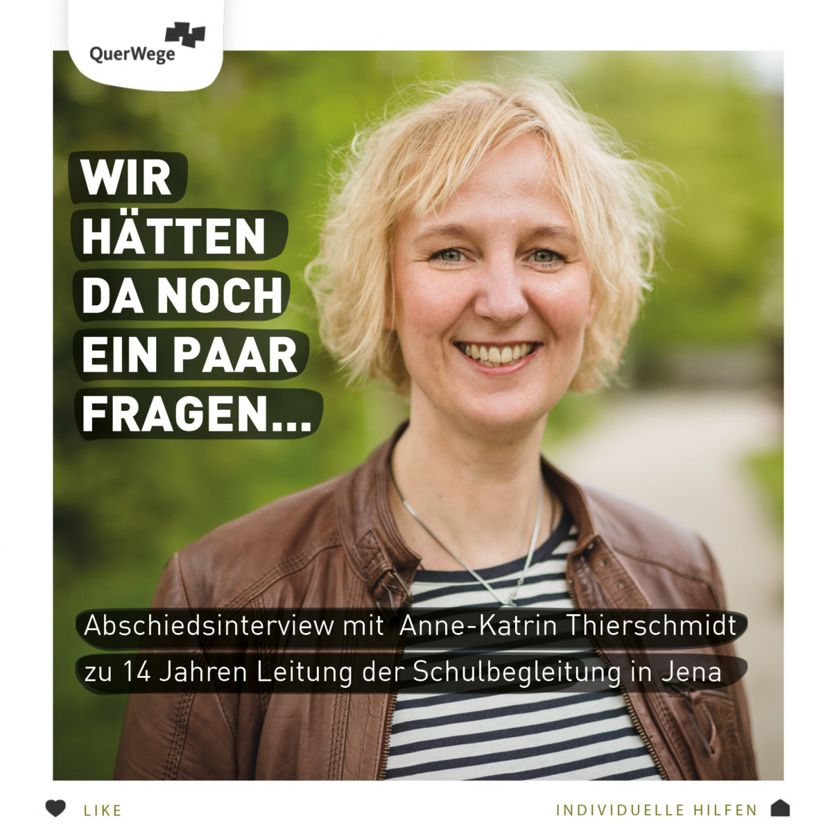 Anne Katrin-Thierschmidt hat im Dezember 2008 den Bereich Individuelle Hilfen übernommen und diesen seitdem maßgeblich geprägt, sich unermüdlich für Qualität in der Schulbegleitung eingesetzt, Weiterbildungen, Fallberatungen und Supervisionen etabliert, war in Verhandlungen und Gesprächen mit Entscheidungsträger eine starke Stimme für unser Anliegen, hat in Jena mitgeholfen, Standards zu schaffen und hat ein großes, vielfältiges Team (zusammen-)geführt. Ihre tolle Arbeit hat die Individuelle Hilfen und auch QuerWege (dessen Vorstandsmitglied sie 8 Jahre lang war) enorm bereichert.