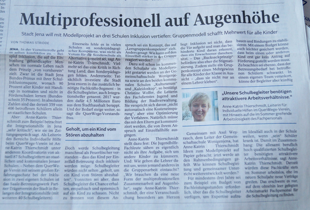 Die TLZ im Gespräch mit Anne-Katrin Thierschmidt, Leiterin für Individuelle Hilfen des QuerWege e.V., mit Hinweis auf die im Sommer greifende Arbeitslosigkeit des Fachpersonals. Zu lesen in der TLZ.