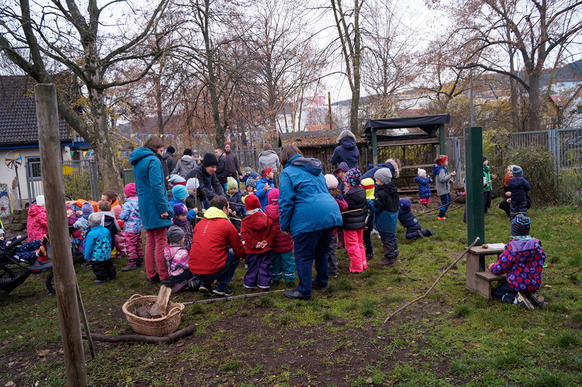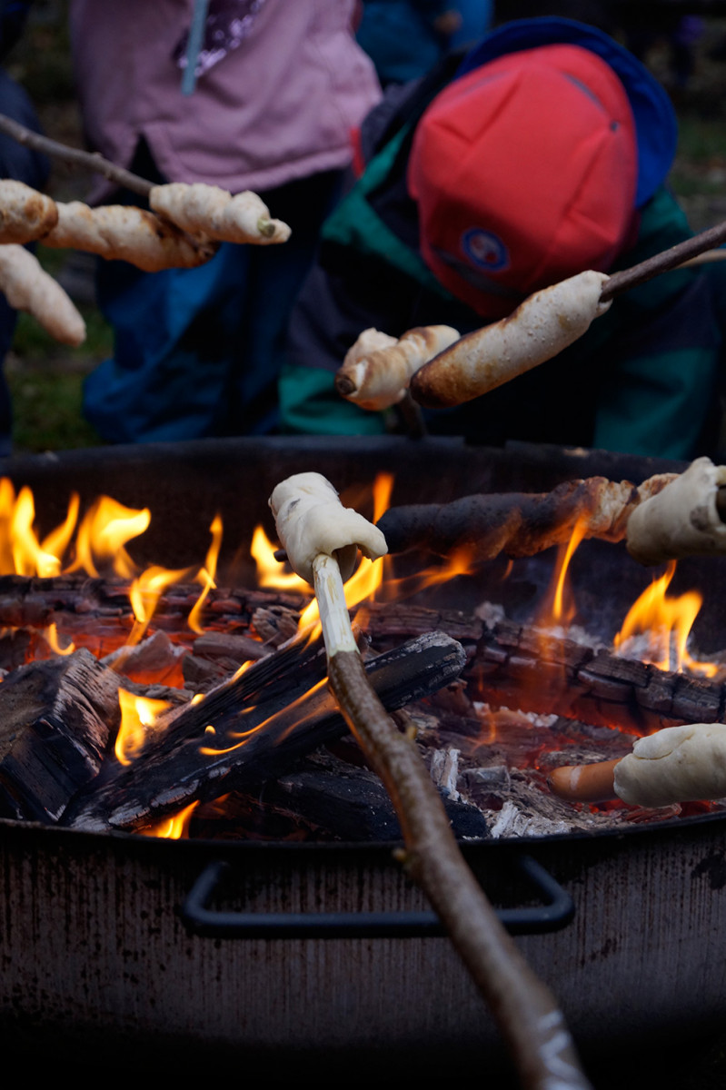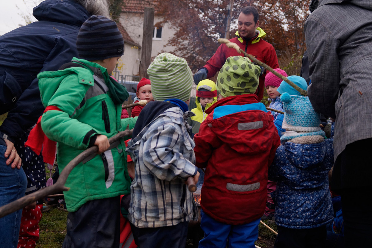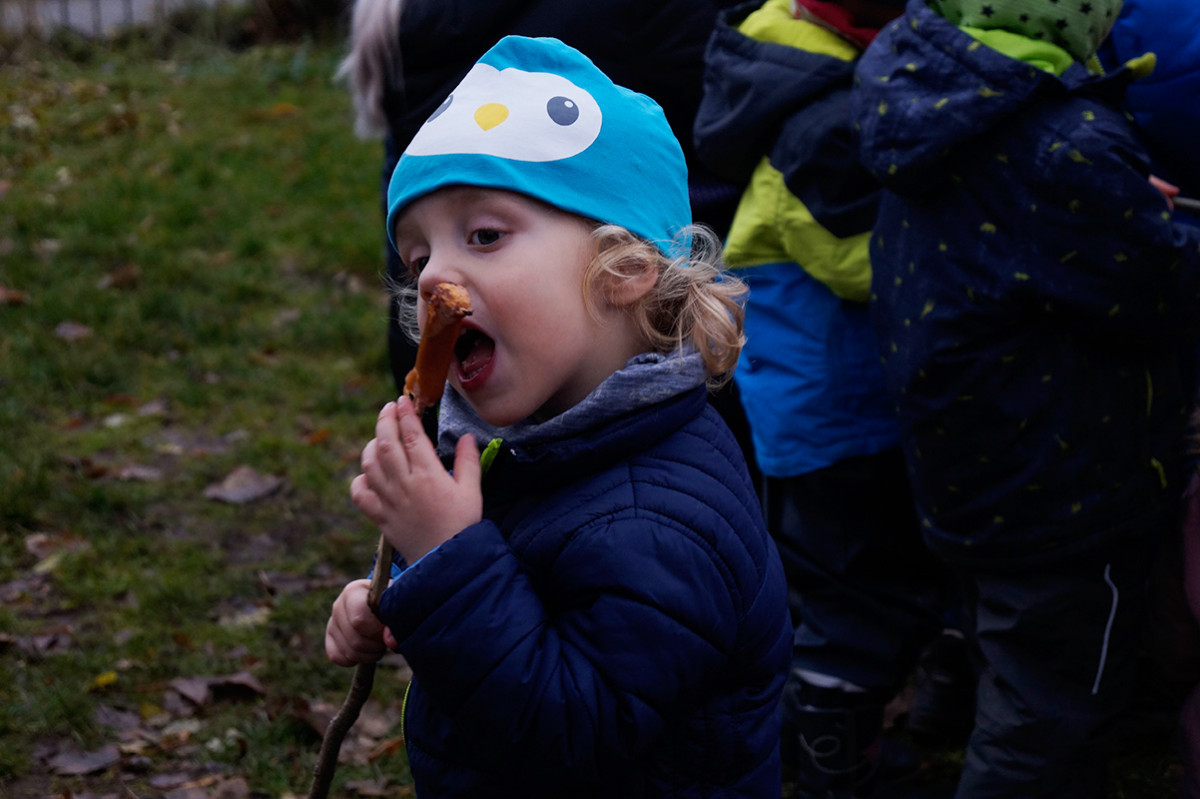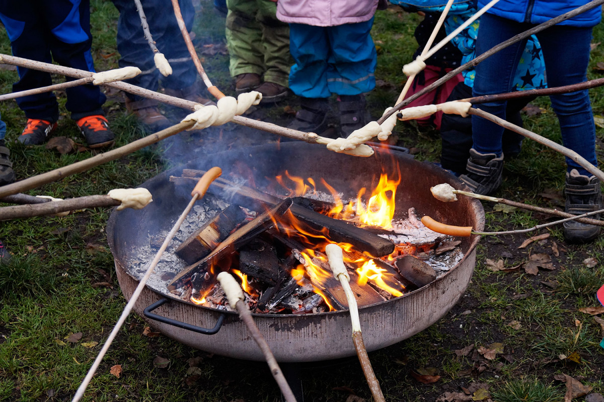 Die Feuerfische luden am Mittwoch, dem 27.11. vormittags zum Lagerfeuer ein. Ein kleiner Feuerfisch ist nämlich so faszniert von dem Element, dass es immer mal wieder Thema im Kitaalltag war und die Gruppe beschloss, selbst eins zu machen und alle Kinder dazu einzuladen. Aufgeregt brachten am Morgen alle Kinder ihre eigenen Stöcke von Zuhause mit und um 10 Uhr brannte ein schönes Feuerchen im Garten, natürlich unter dem wachsamen Auge der Pädagog*innen und Hausmeister Mario. Dann wurde Stockbrot gebacken, Würstchen gebruzelt und Mashmellows karamellisiert. Alle hatten sehr viel Spaß und ließen es sich schmecken. Lecker und Danke!