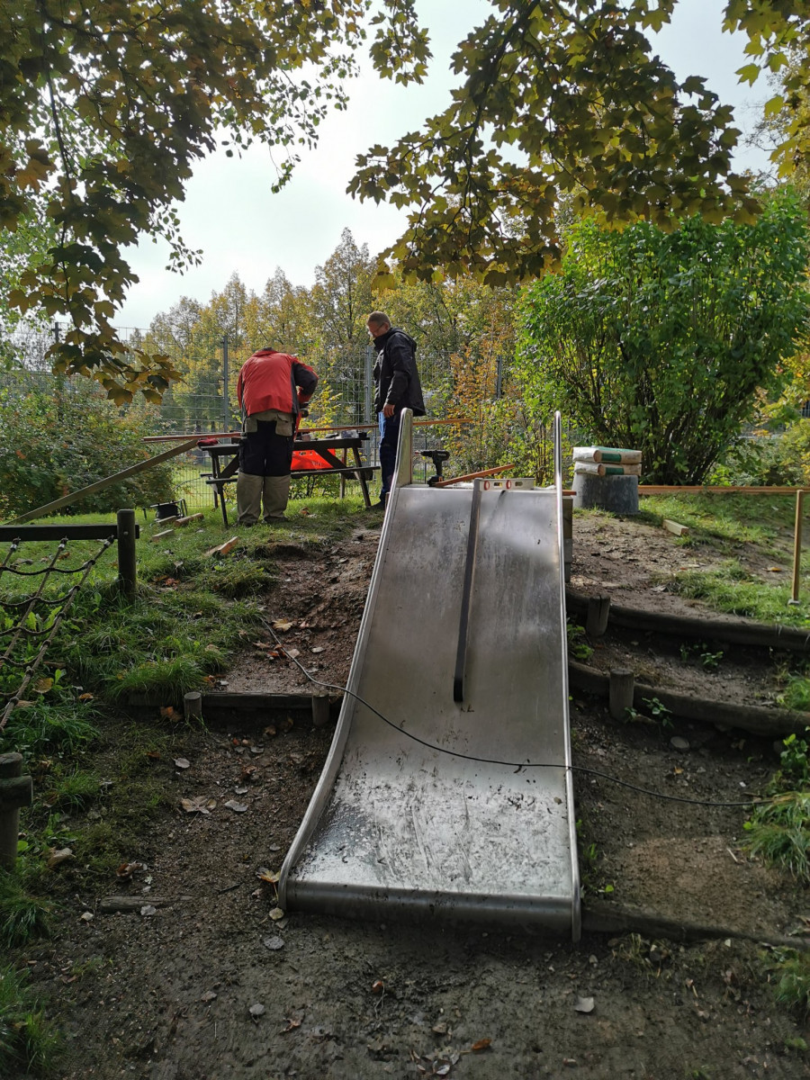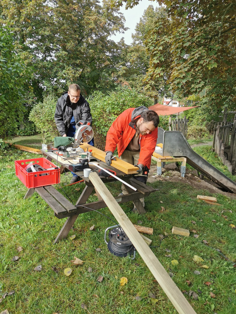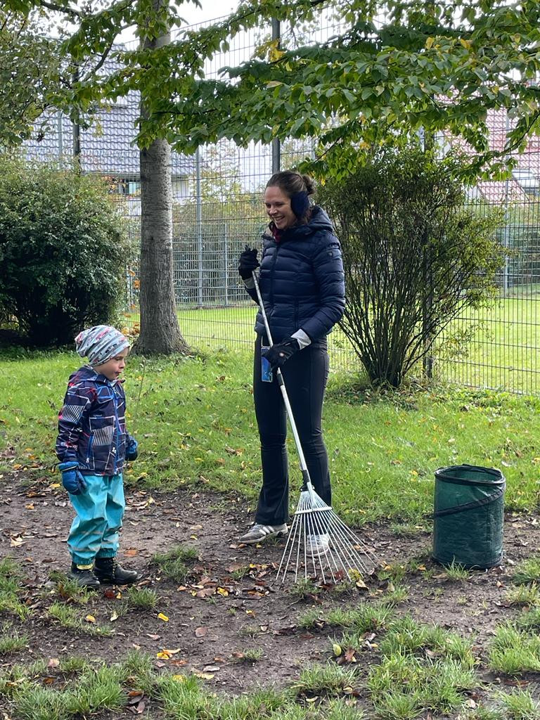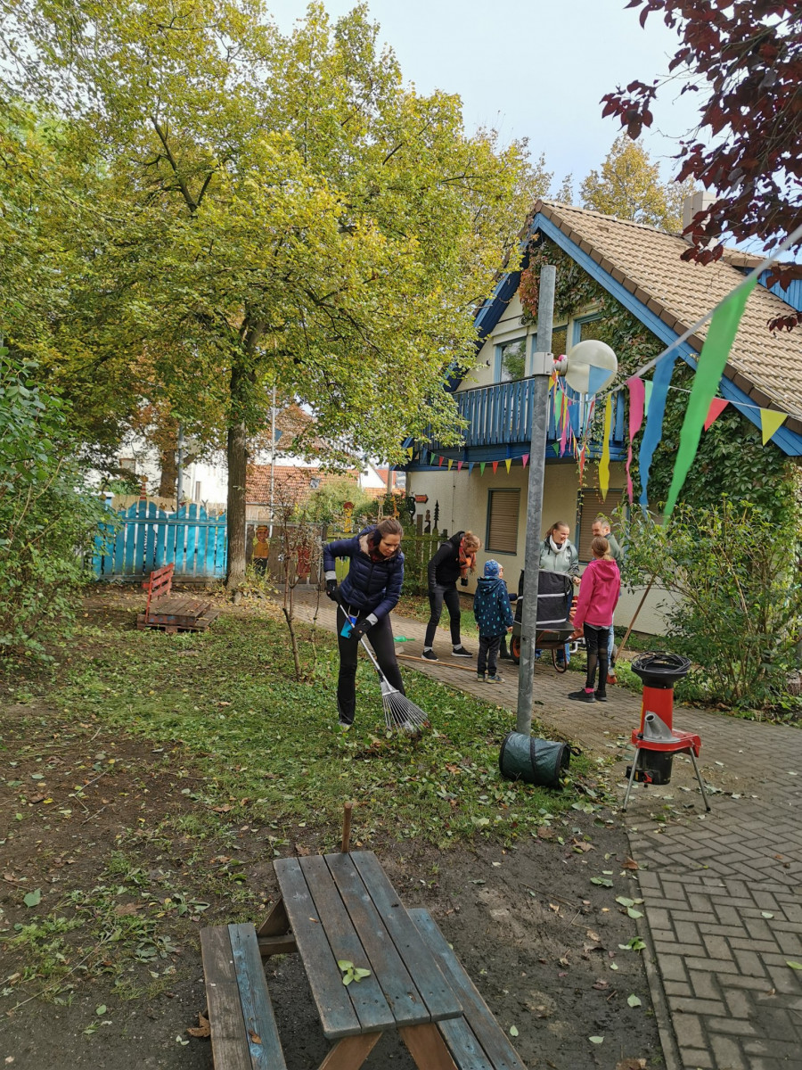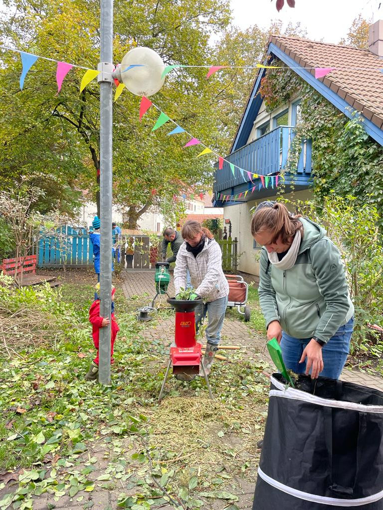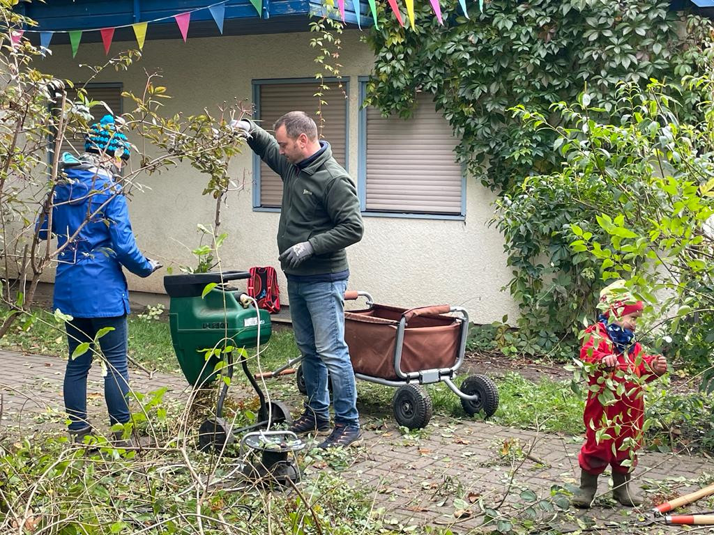 Am Samstag den 16.10.2021 haben wir gemeinsam mit vielen fleißigen großen und kleinen Helfer*innen unseren Garten auf den Winter vorbereitet. Sträucher und Hecken wurden verschnitten, Äste gehäckselt, Laub zusammen gerecht und unsere Rutsche wurde angehoben, damit sich auch bei regnerischem Wetter keine Pfütze auf ihr bildet. Nach getaner Arbeit ließen sich die Kinder und Erwachsenen das Mittagessen schmecken.