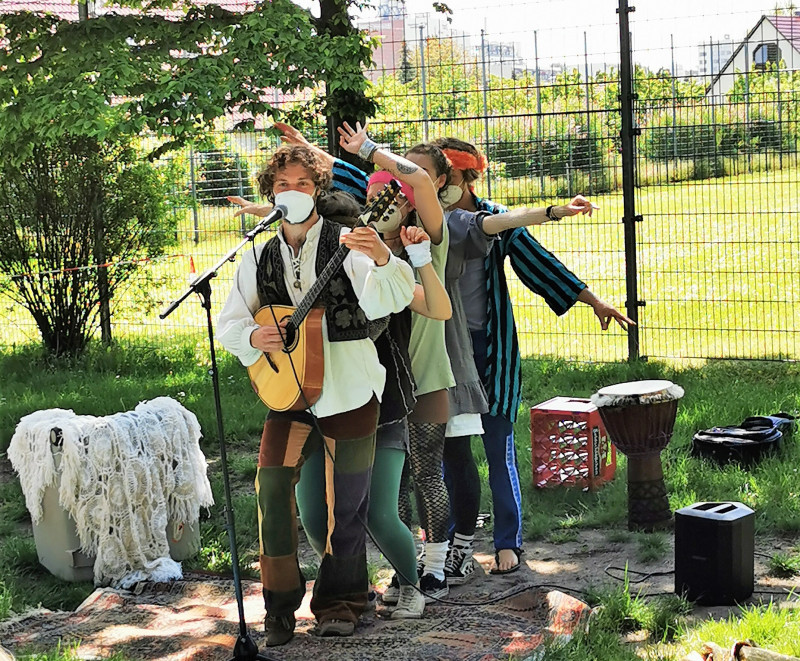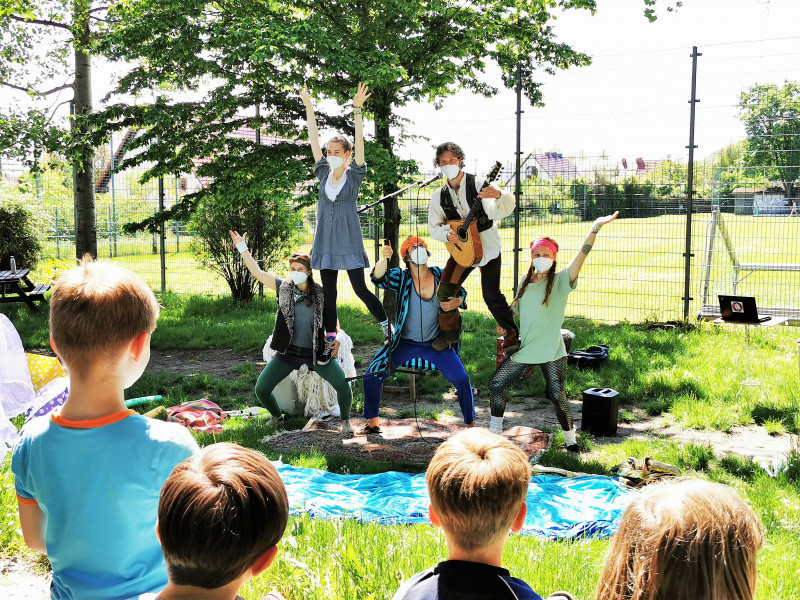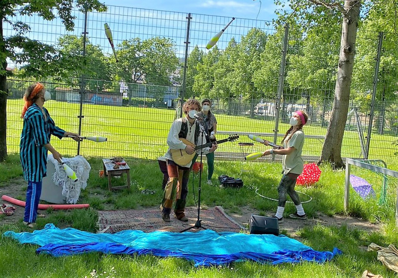 Plötzlich kamen lustig bunte Artisten vom Zirkus MOMOLO in unseren Garten gelaufen. In 2 Aufführungen zeigten die Künstler ihre Kunststücke, luden die Kinder zum Mitmachen ein. Wir sangen gemeinsam Lieder und gingen auf “die Löwenjagd”. Die Kinder und wir waren begeistert.