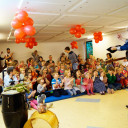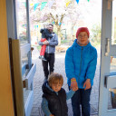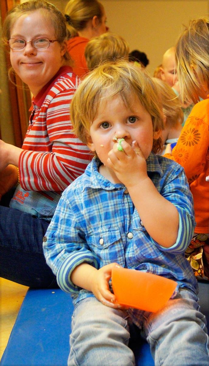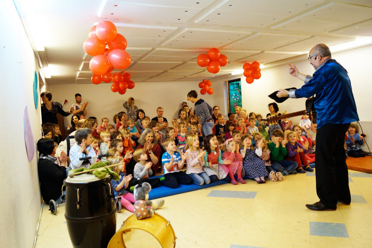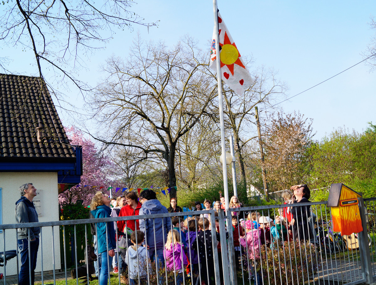 Die Festwoche wurde am heutigen Morgen feierlich, mit dem Hissen der selbstgestalteten Fahne, eröffnet. Endlich flattert sie vor der Integrativen Kita Schwabenhaus im Wind und begrüßt all seine Gäste. Der Kinderliedermacher Rainer Püschel lud die Kinder zu einem Tanz-Sing-Musizier-Träum-Zuhör-Mitmach-Lausch-Lach-Überleg-Spass-haben-Konzert ein. Der Vormittag verging wie im Fluge und als krönender Abschluß wurde die riesengoße Geburtstagstorte enthüllt, angeschnitten und schmeckte fantastisch. Mmmmhhh…