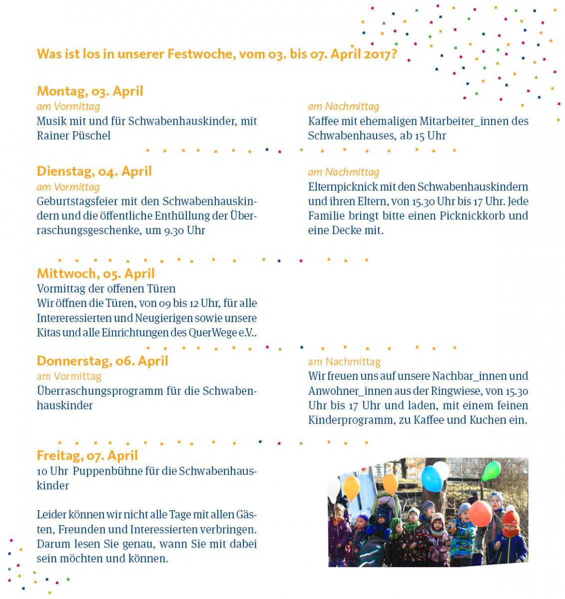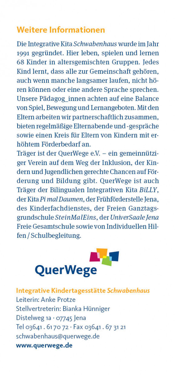 Daher ist das anstehende Jubiläum der Kita Schwabenhaus nicht nur unser Geburtstag sondern auch ein Meilenstein für die Inklusionsbewegung in Jena. Und das wird vom 3. bis zum 7. April gebührend gefeiert und von vielen Aktionen begleitet.