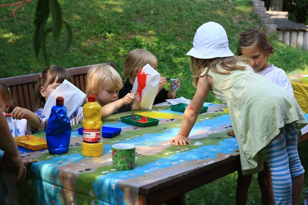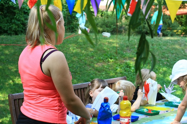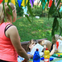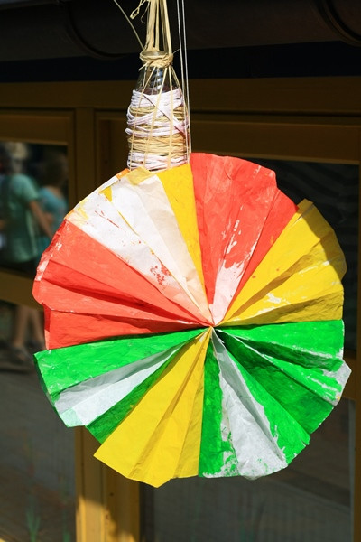 Für eine Blume braucht man 8 Butterbrottüten. Diese mit Wasserfarbe anmalen und trocknen lassen. Anschließend aufeinander kleben. Nun am offenen Ende eine Rundung abschneiden. Zuletzt die oberste und unterste Tüte zueinanderführen und Verkleben. Eine Blütenrosette entsteht. Einen Faden durchfädeln und aufhängen