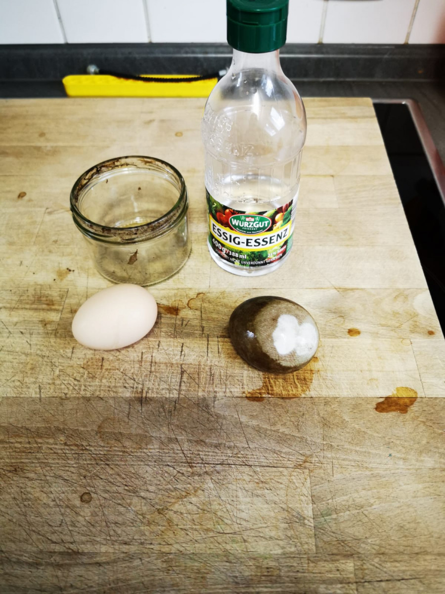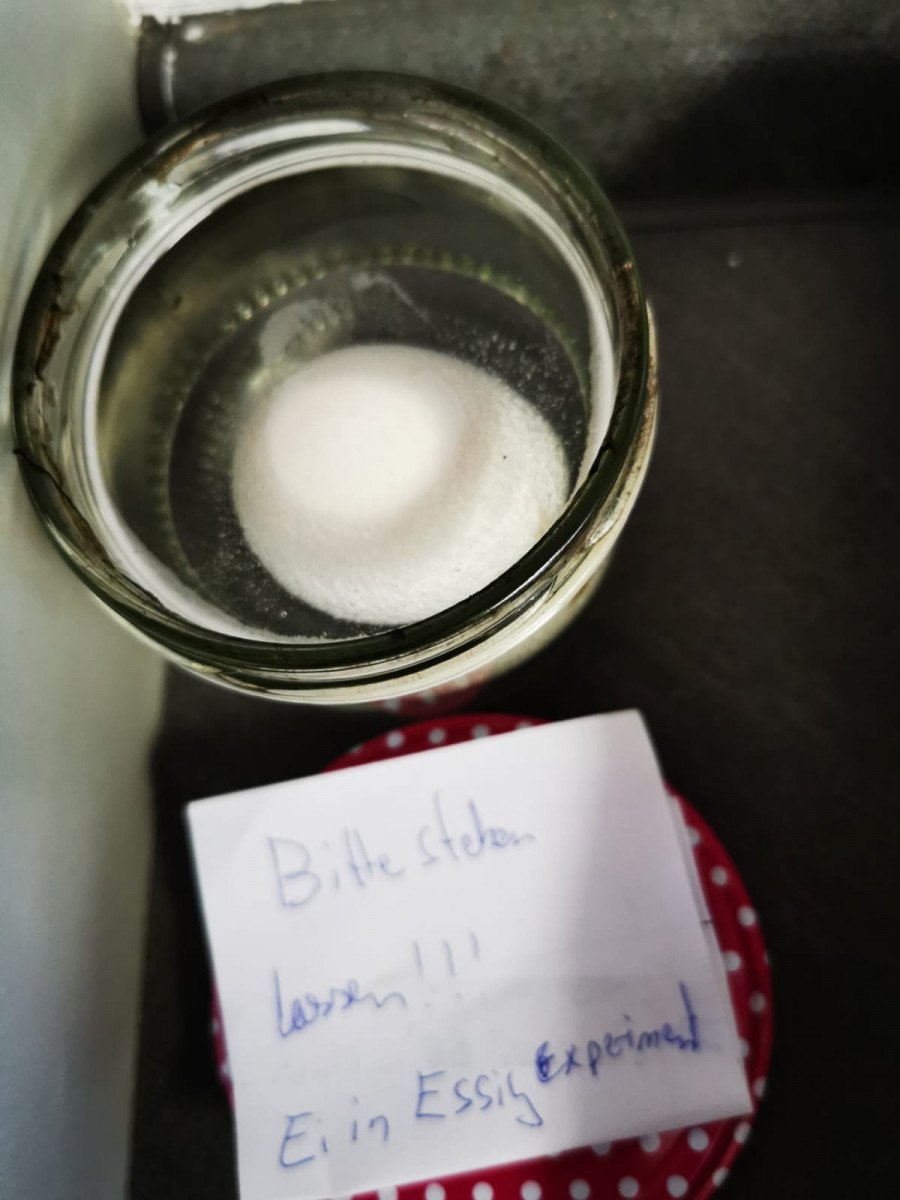 Die Kinder hatten soviel Freude an der Veränderung des Eis, dass sie den Versuch ein zweites Mal durchführten. Diesmal ohne Lebensmittelfarbe, dafür über das lange Wochenende. 96 Stunden lag das Ei im Essig. Die Schale löste sich, wie beim ersten Versuch, komplett auf, aber das Ei war nun innen nicht mehr flüssig sondern geronnen und fest.