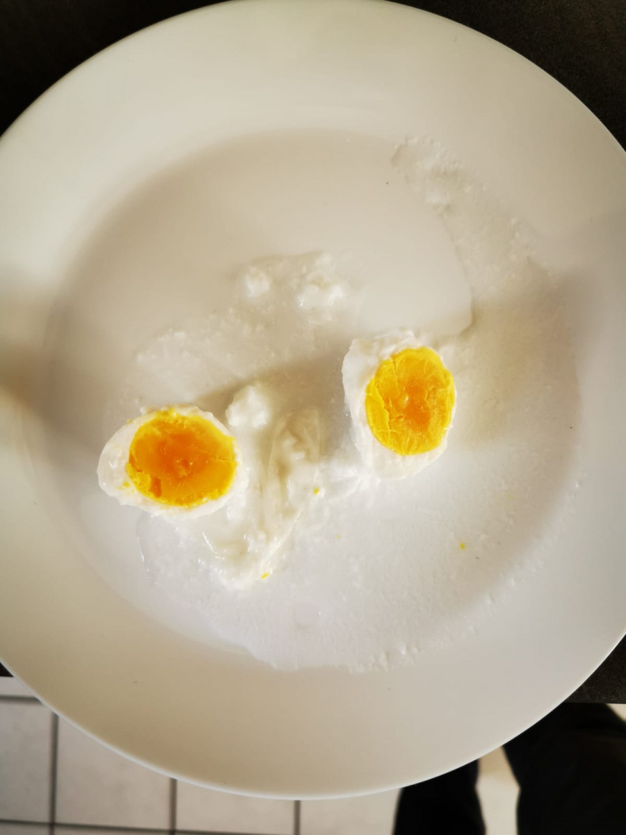 Vorher: Gewicht: 62g Umfang horizontal/vertikal: 13cm/15cm Konsistenz: Schale hart – Innen flüssig