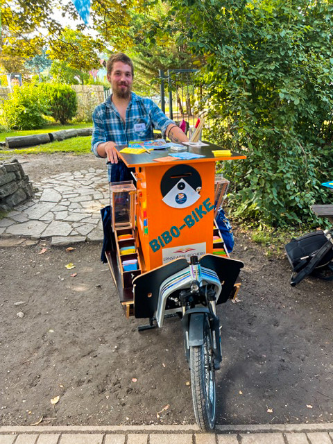 Anziehungspunkt war das auffällige und liebevolle gestaltete Bibo-Bike, dass jede Menge Zettel, Stifte und einen Briefkasten bietet, um alle Gedanken einzufangen und festzuhalten. Unsere Mitarbeiter_innen, wie David, der oft die Bibliothek aufsucht, aber auch eine Vielzahl von Eltern beteiligten sich angeregt an der Aktion. Ob als Begegnungsstätte, der Wunsch zu Wegen der Digitalisierung, stimmungsvolle Atmosphäre um in Medien zu schwelgen – bei einem waren sich alle einig: Es bedarf einer Bibliothek, die mit der Zeit geht und alle erreicht.