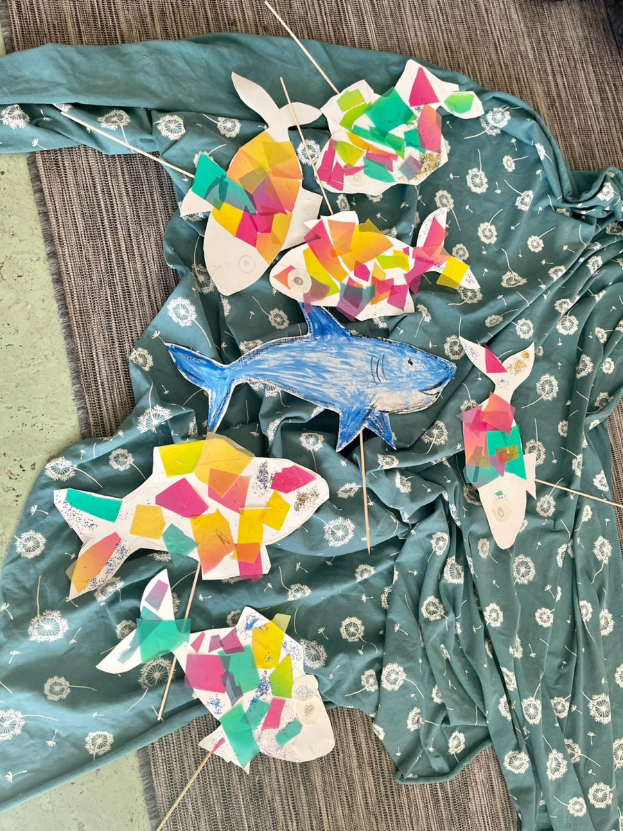 Hören-Sehen-Verstehen-Zählen-Merken-Mitsprechen! Mit Feuereifer gestalteten wir auch bunte Glitzerfische, die immer wieder auf’s Neue vom Hai gefressen werden.