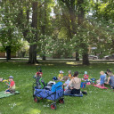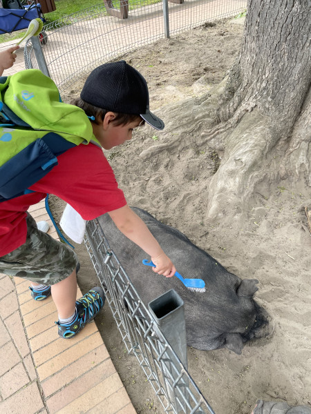 Für die Kinder war es super aufregend, denn bis kurz vor dem Ziel wussten sie nicht, wohin es geht. Auf einer Wiese haben wir mit selbstgemachten Muffins und Knabbereien ein Picknick gemacht. Gestärkt ging es in den Tierpark. Dort konnten wir viele Tiere füttern, die Hängebauchschweine bürsten, die Ziegen streicheln und das beeindruckende Rad des Pfau beobachten. Toll war natürlich auch der Spielplatz. Zurück im Kindergarten feuerte Benni gleich den Grill an. In der Zwischenzeit haben die Kinder ihre Schlafplätze vorbereitet und draußen gespielt. Das war megatoll, denn wir hatten den Kindergarten ganz für uns allein. Zum Abendessen gab es Bratwurst, gegrillte Wiener, leckeren Nudelsalat und Brötchen. Hmmmmm, das war lecker!!!!!