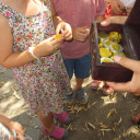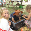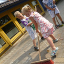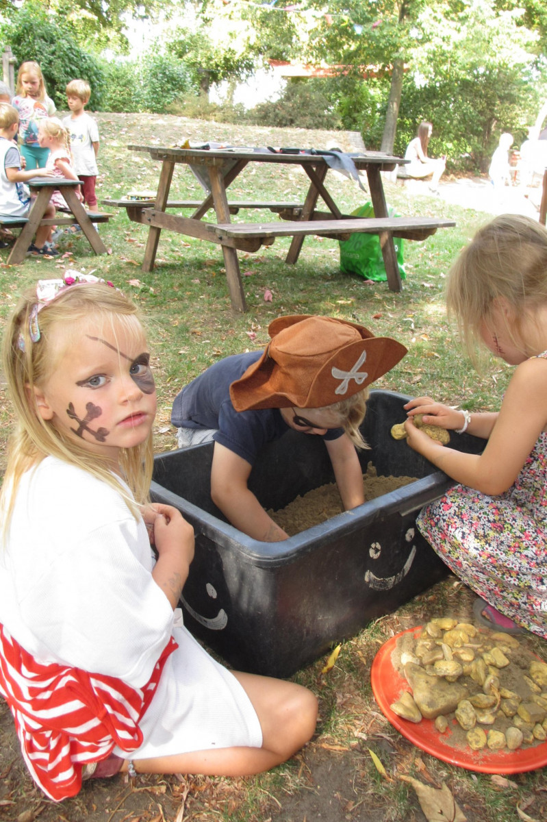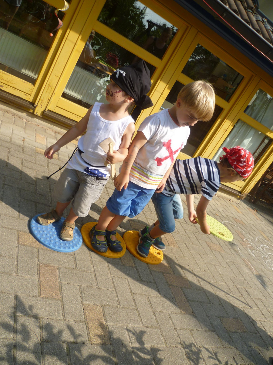 - Um ihr Projekt zum Thema „Piraten“ abzuschließen, feierten die „Feuerfische“ der Kita Schwabenhaus am 08.08.2018 ein kleines Piratenfest. Die Kinder konnten an dem Tag bereits als Piraten verkleidet in die Kita kommen und / oder sich von den Pädagoginnen als Piraten schminken lassen. Das Piratenfest begann mit dem Lied „Wer will wilde Piraten sehen“, das von allen kleinen und großen Piraten lauthals mitgesungen wurde. Und was wäre es für ein Piratenfest gewesen, wenn es keine richtige Schatzsuche gegeben hätte? Also versammelten sich die wilden Piraten mit ihrer jeweiligen Kapitänin in drei Gruppen bei schönstem Wetter im Garten der Kita. Dort mussten sie erst einmal einige Aufgaben, wie z. B. Goldklumpen schürfen, das Deck schrubben, von Insel zu Insel hüpfen, erfüllen und „Tätowierungen“ sammeln. Als schließlich die Mannschaften alle Aufgaben mit Bravour gemeistert hatten, gab es für jede Gruppe die heiß ersehnte Schatzkarte. Durch diese erhielten sie weitere wichtige Hinweise für ihre Suche nach dem geheimnisvollen Schatz, der irgendwo im Garten versteckt war. Nach einer spannenden Suche fanden die wilden Piraten dann endlich die Schatztruhe, die nur mit einem Zauberspruch zu öffnen war. Und so wurden alle Piraten am Ende mit wunderschönen Muscheln und leckeren Schokoladen-Goldtalern belohnt. Alles in allem war das Piratenfest also ein sehr gelungener Abschluss des Piratenprojekts.