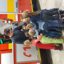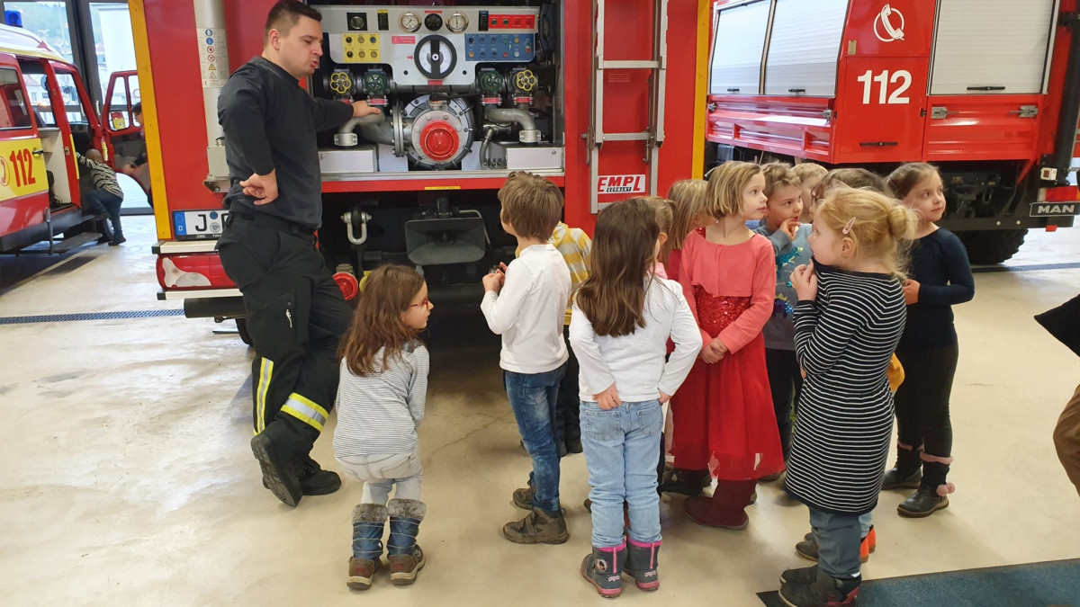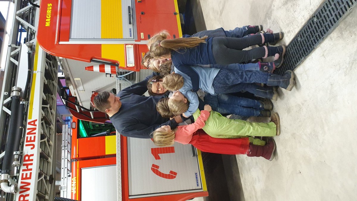 Nach einem lautstarken „Yeah!“ und „Hurra!“ liefen wir weiter zur Hauptwache der Jenaer Berufsfeuerwehr. Erwartet wurden wir von Benni, einem jungen Feuerwehrmann, welcher uns mit einer deutlich spürbaren Freude zu seinem Beruf, leuchtenden Augen und sehr anschaulich alles rund um die Feuerwehr erklärte. Die Kinder staunten, was es so alles in einem Feuerwehrauto zu entdecken gibt. Da gab es verschiedene Wasserspritzen, Wasserschläuche, Kabeltrommeln, Kettensägen, Seile, riesige Lampen…