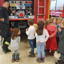Auch ein Rettungsboot und Taucheranzüge konnten die Kinder anschauen. Und den nagelneuen Rettungswagen der Feuerwehr, in den sie auch hineinklettern und sich auf die Trage legen durften. Einen echten Alarm erlebten wir auch und konnten mit großen Augen beobachten, wie flink die Feuerwehrmänner und Feuerwehrfrauen angerannt kamen, sich blitzschnell neben dem Feuerwehrauto umzogen und dann hineinsprangen und mit Sirene und Blaulicht davonfuhren. Benni führte uns dann noch in die Rettungsleitstelle und erklärte auch hier alles ganz genau. Zum Schluss durften wir noch in die Kantine, lernten den Koch kennen und Benni zeigte uns, wo Feuerwehrmänner schlafen.