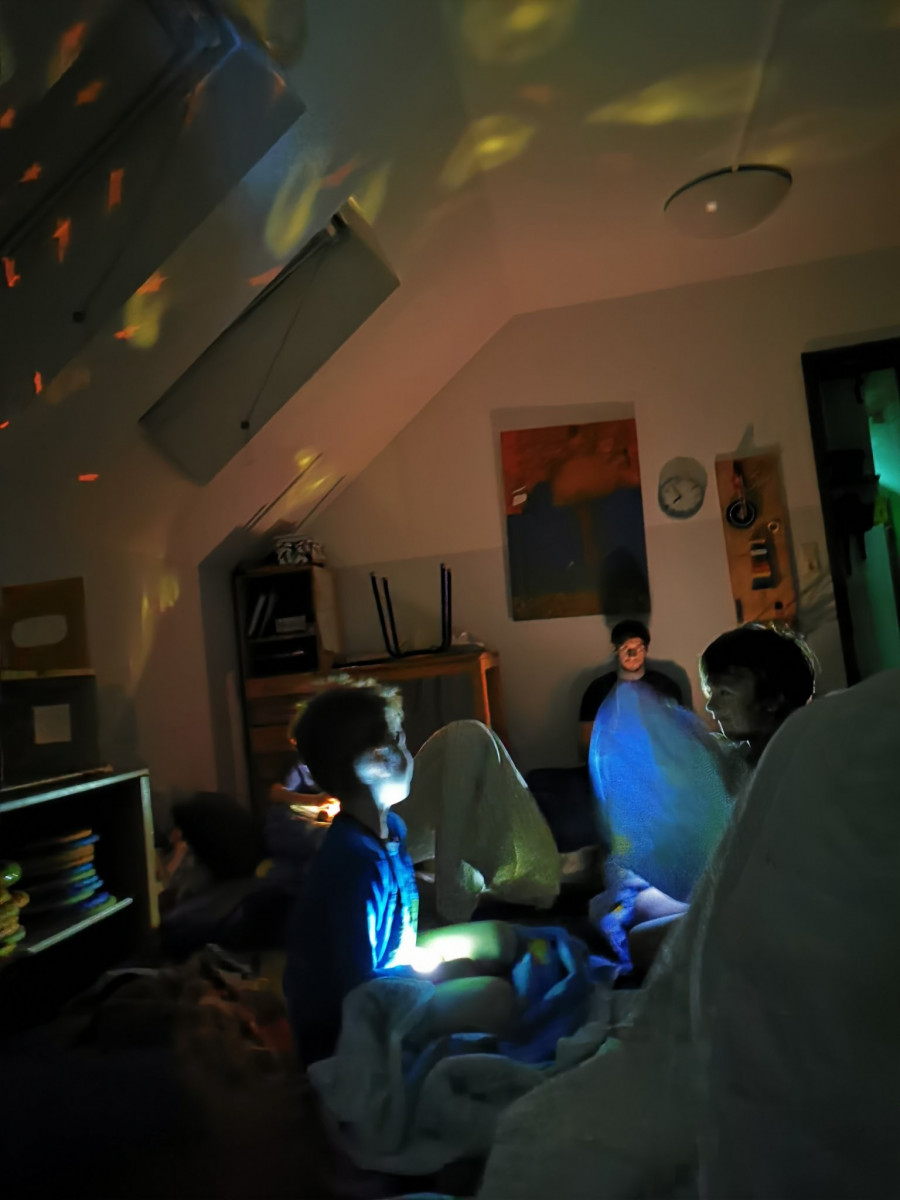 Glücklich, zufrieden und auch etwas geschafft machten wir uns auf den Weg zurück zum Kindergarten. Dort wurden wir mit gemütlich eingerichteten Schlafecken und einem leckeren Abendbrot empfangen. Im Turnraum tanzten und sangen wir alle gemeinsam und ein lustiges Sockentheater verabschiedete die Kinder in ihre Schlafsäcke.
