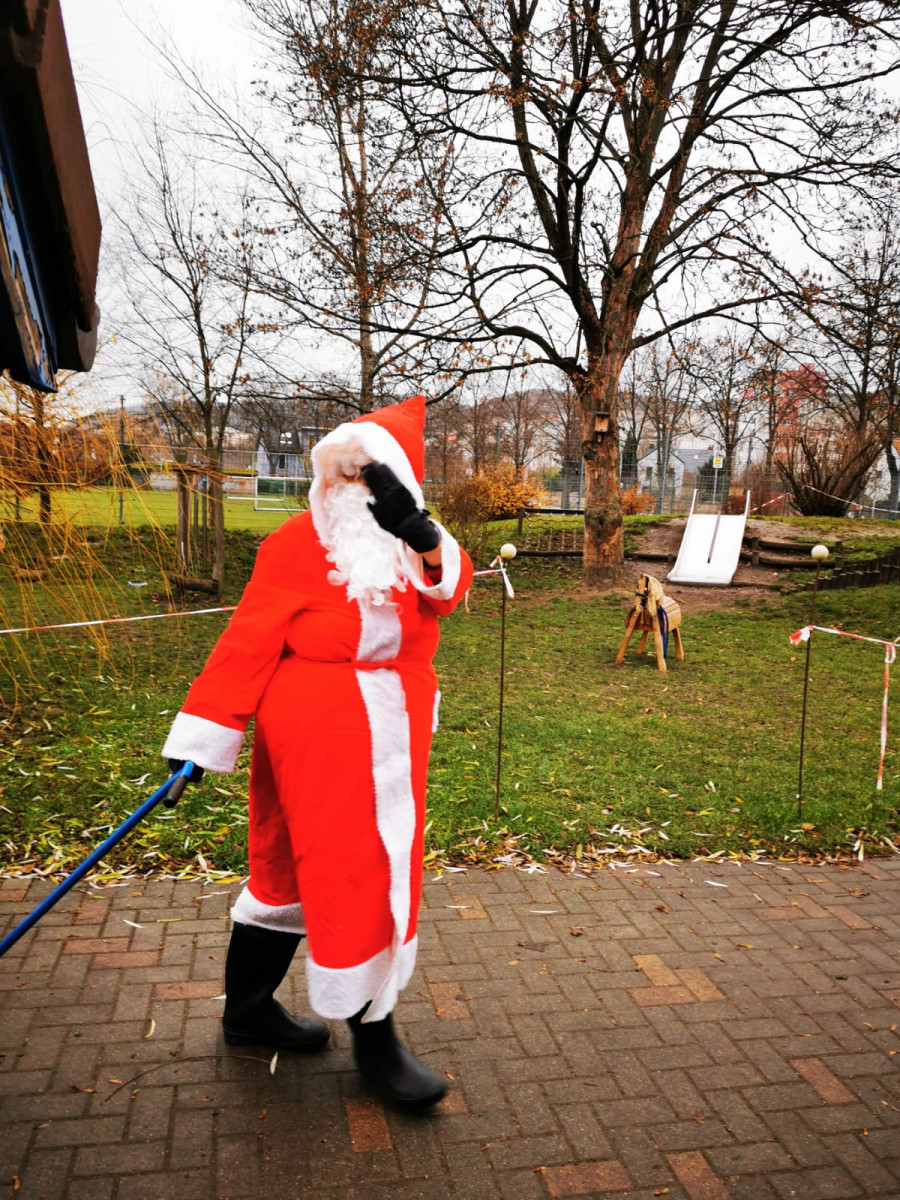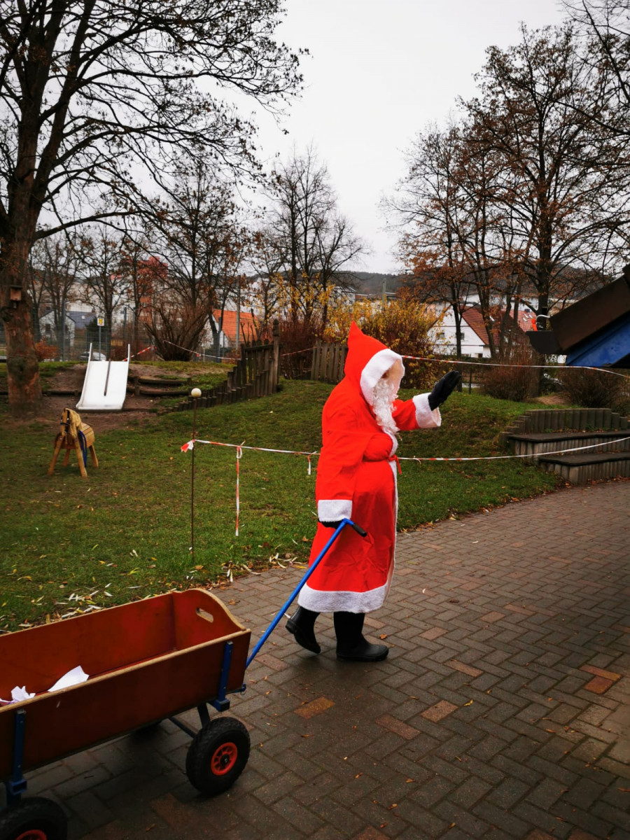Am 15.12.2020 kam ein überraschender Besuch in unseren Kindergarten. Laut der WHO ist der Weihnachtsmann immun gegen das Corona-Virus und darf die Kinder in der Welt, trotz seines gehobenen Alters, besuchen und beschenken. So freuten sich die kleinen und großen Schwabenhäusler über den Besuch des Weihnachtsmannes. Da in unserem Garten zurzeit leider kein Schnee liegt, musste der Weihnachtsmann die vielen Geschenke mit seinem Bollerwagen zu uns bringen. Die Kinder beobachteten mit großen Augen, wie der Weihnachtsmann die Geschenke vor ihren Balkontüren abstellte. Sie winkten und jubelten ihm zu. Im jeweiligen Gruppenraum war die Freude beim Auspacken der Geschenke sehr groß.
