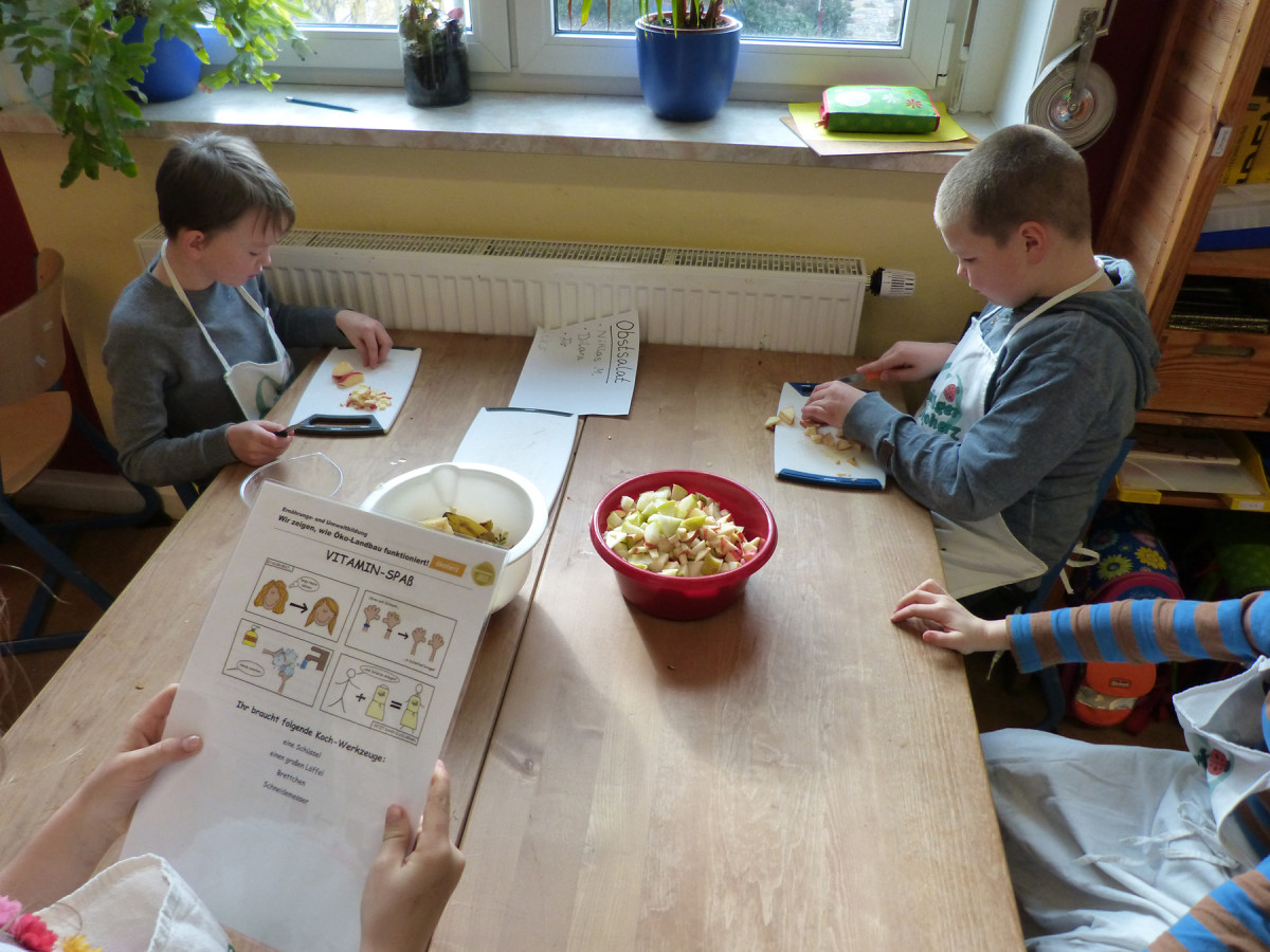 Am ersten Tag kamen drei Leute vom Ökoherz. Da lernten wir, wie wir uns um Tiere kümmern. Außerdem machten wir ein gesundes Frühstück. Das alles fand in dem Kieselsteinraum statt.