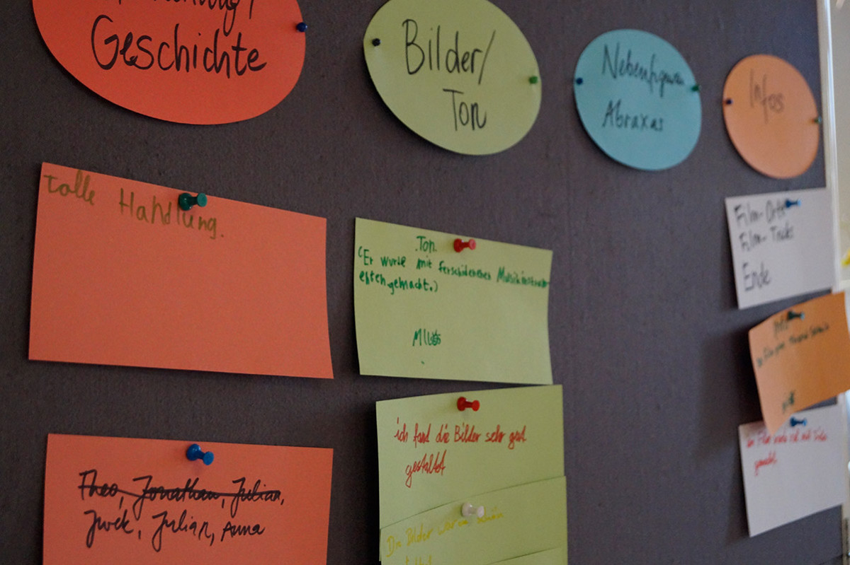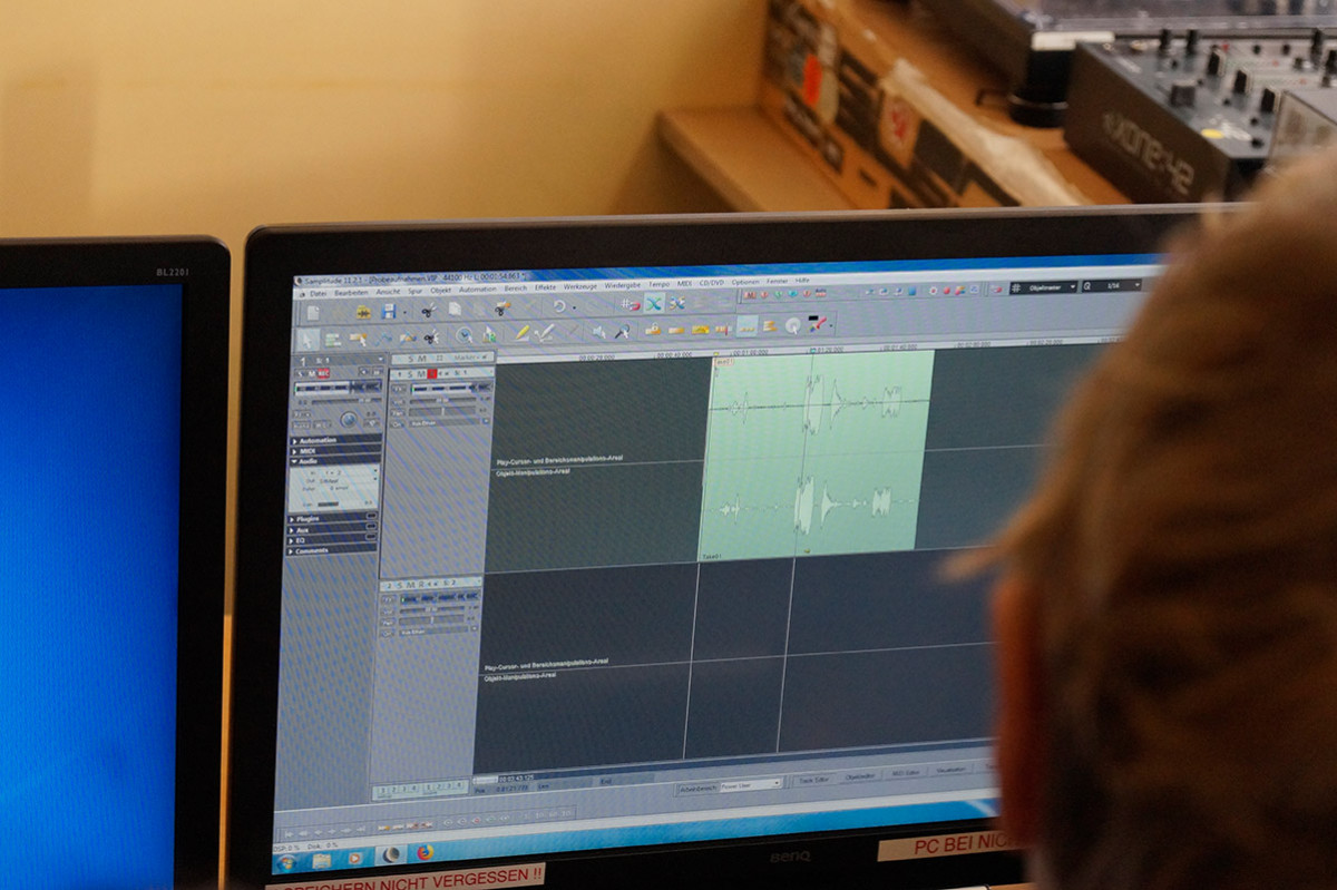 Zu Beginn trugen die Meilensteine Infos zu den verschiedenen Themen (über die Handlung, die Hauptfigur sowie die Nebenfiguren und den Raben Abraxas zusammen). Danach teilten sich die 11 Schüler und Schülerinnen in drei Gruppen auf und gingen in die Tonstudios. Dort lernten sie, welche Regler und Knöpfe am Schaltpult welche Funktionen haben und wie ihre Stimmen aufgenommen werden. Außerdem zeigten ihnen Julia und Anja vom OKJ, wie Audio-Aufnahmen geschnitten werden (z.B. wenn die Pausen zwischen den Sätzen zu lang sind) und wie man Töne zusammen fügt. Zu den drei Themen überlegten sich die Meilensteine Texte und sprachen sie dann für die Filmvorstellung ein.