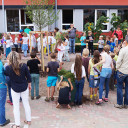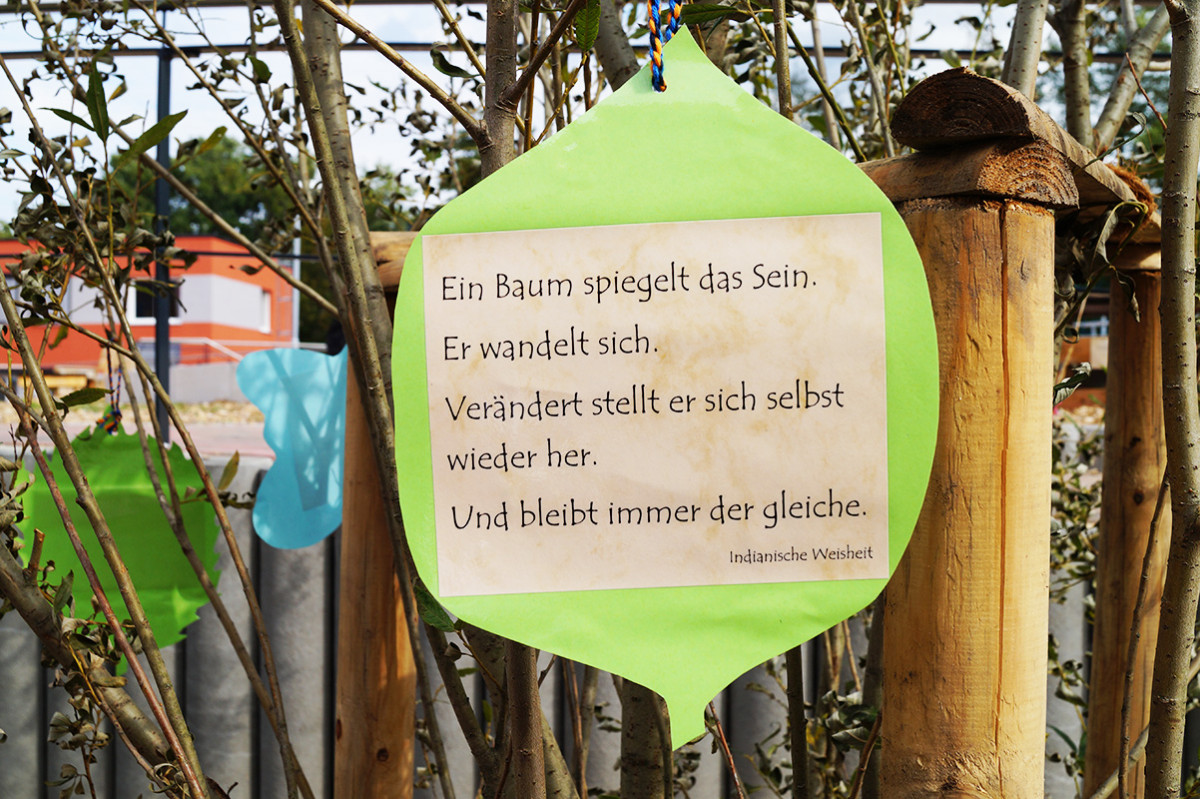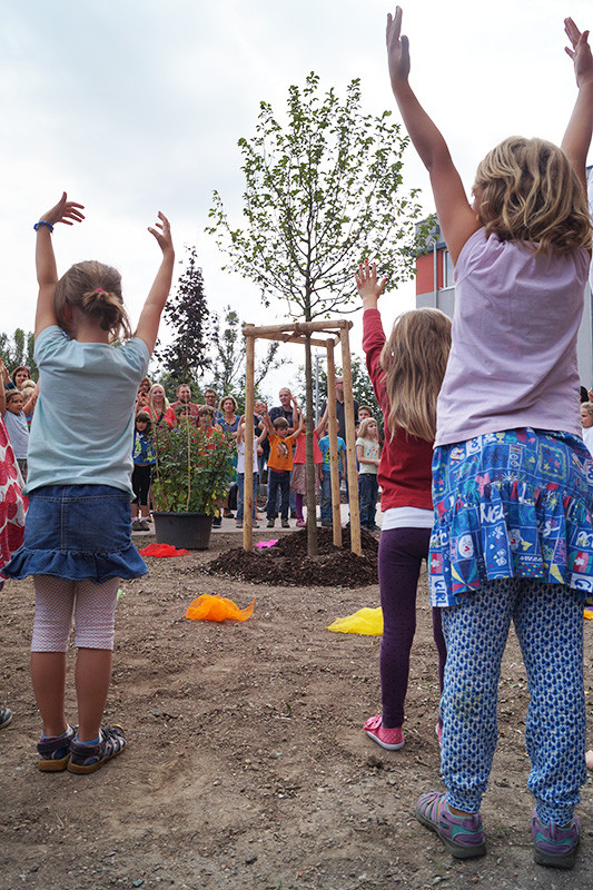 Heute fand in unserer Grundschule SteinMalEins im Paradies das Bäumchenfest statt. Mit Liedern und Tanz wurde der Grundschulbaum, eine Magnolie, feierlich begrüßt. Eingeladen waren Eltern und Sponsoren, die gleichzeitig gemeinsam mit den Kindern und Pädagog_innen das Schuljahr mit neuem Schulhof eröffneten. Bereits ein paar Tage zuvor wurden die vier Stammgruppenbäumchen gepflanzt: eine Salweide, eine Zierblutpflaume, ein rotblättriger Ahorn und eine gelbe Weide. Sie sollen in den nächsten Jahren kräftig wachsen, damit sie in Zukunft viel Schatten spenden. Die Pflege und regelmäßiges Gießen wird von den Stammgruppen übernommen.