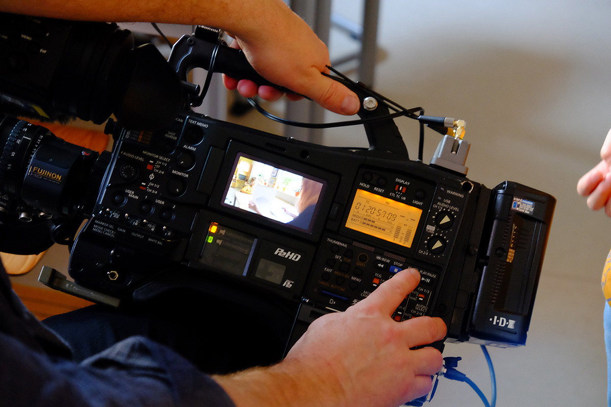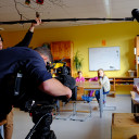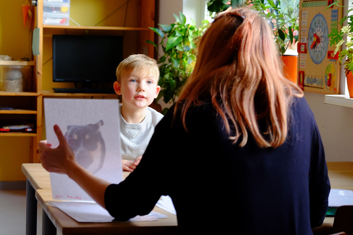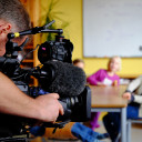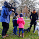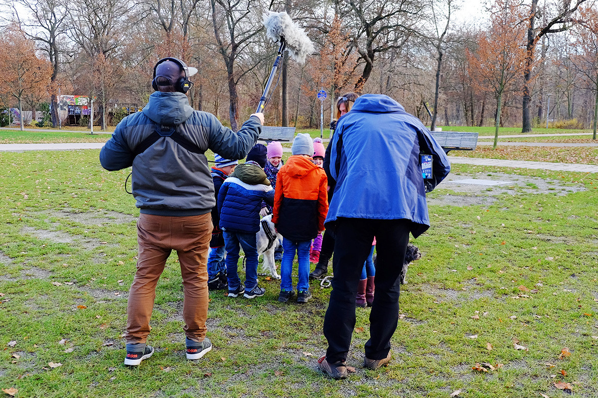 Der erste Jahrgang der Achate interessierte sich jedoch weniger für den wissenschaftlichen Hintergrund des Filmdrehs. Sie freuten sich vielmehr, dass SteinMalEins-Pädagogin Carolin ihre zwei Hunde Oskar und T-Rex mitgebracht hatte, die ebenfalls Statisten im MDR-Beitrag sein durften. Nachdem die Kinder mit den Hunden im Park gespielt hatten, wurde im Stammgruppenraum eine Befragung durchgespielt. Eine Wissenschaftlerin zeigte den Kinder die Bilder und wollte wissen, wie die Menschen und Tiere jeweils aussehen (traurig, wütend, aufmerksam… ) – genauso wie der echten Studie. Jedes Kind durfte mal vor die Kamera und zum Abschluß konnten die Achate dann die Kamera und „ihre“ Szenen nochmal bestaunen.