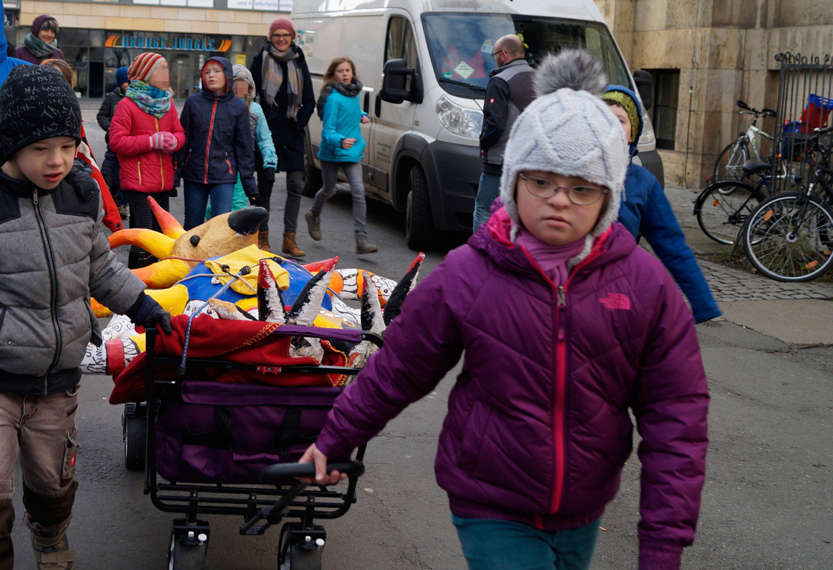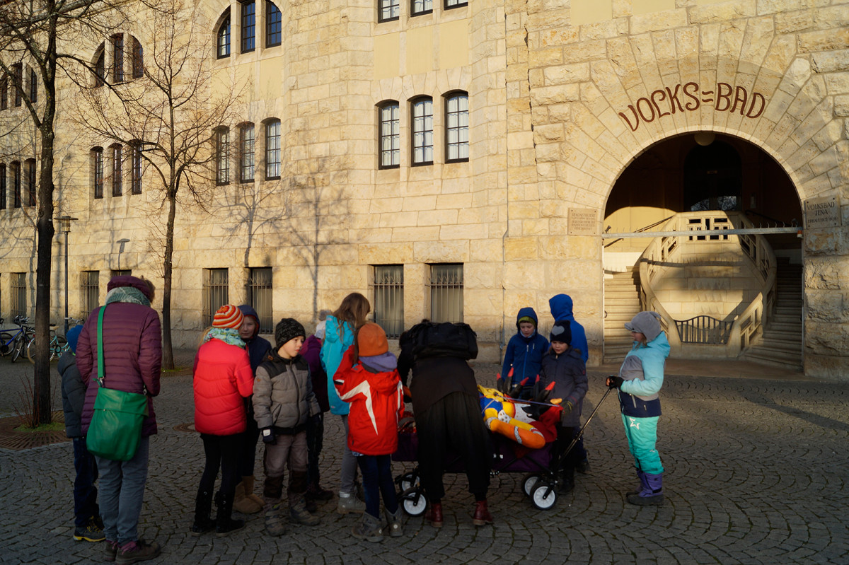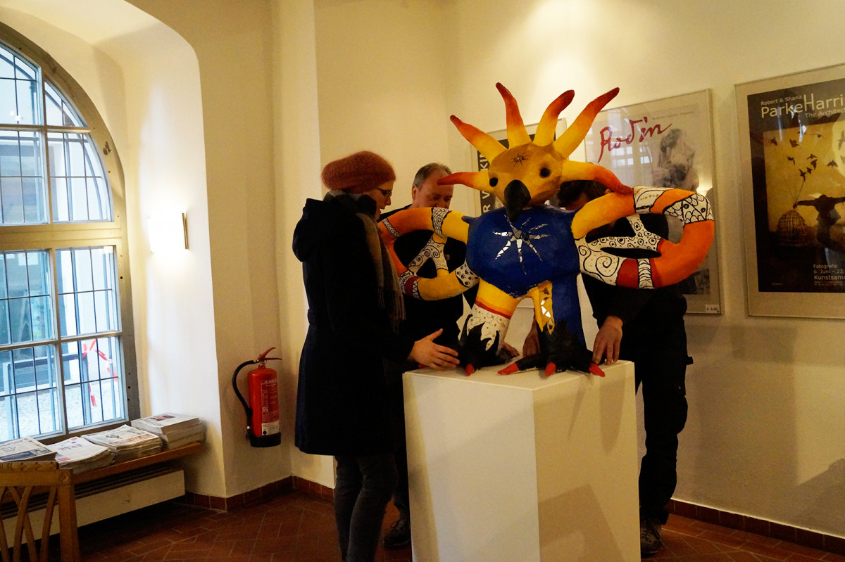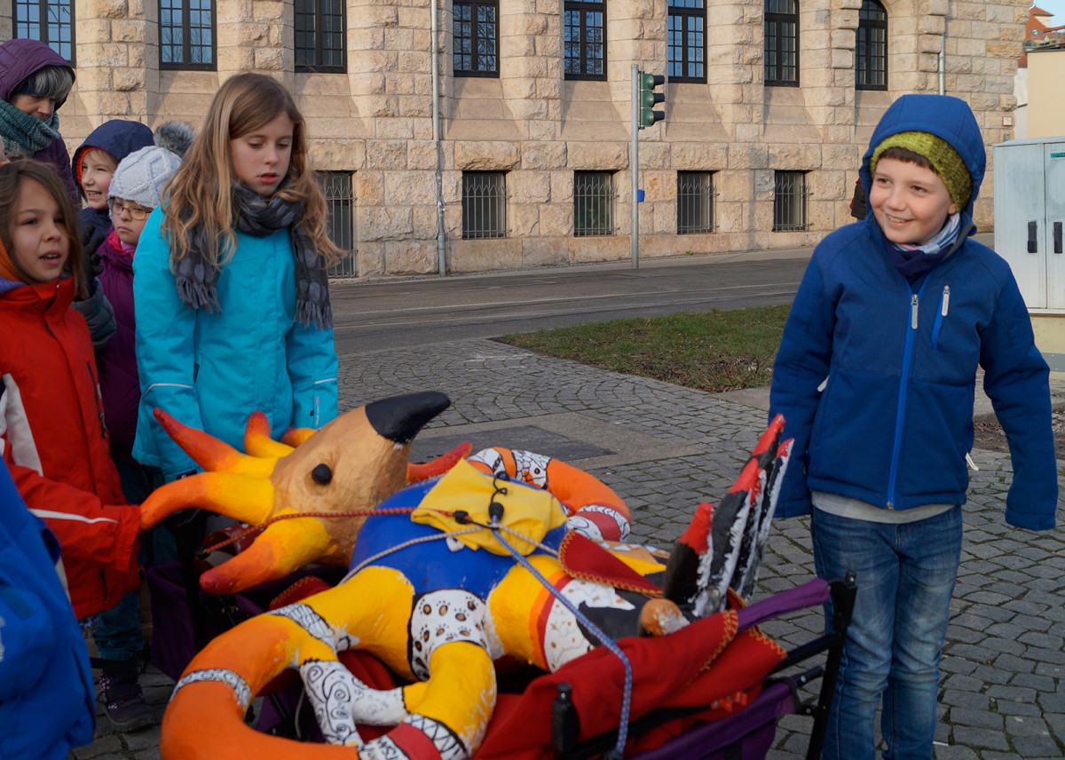 Am Montag dem 15. Januar zog der Phönix, entstanden im Kreativprojekt ”Nikis Welt” mit den Tigeraugen und Achaten der Freien Ganztagsgrundschule SteinMalEins, um in die Kunstsammlung des Stadtmuseums. Bei strahlendem Sonnenschein wurde er auf den Bollerwagen geschnallt und von den Schüler_innen stolz durchs Paradies bis ins Stadtmuseum gezogen. Dort fand er einen würdigen Platz am Eingang zur Wechselausstellung “Niki de Saint Phalle und das Theater”, die noch bis April in Jena ist. Nachdem der Phönix seinen Platz gefunden hatte, schaute Herr Land von der Kunstsammlung unterstützt vom kleinen Farbmonster mit den Schüler_innen „hinter die Kulissen“ und sie entdeckten und erforschten die knallig-bunte Theaterwelt der französischen Künstlerin. Die Schüler_innen waren eifrig dabei und löcherten ihn mit vielen offenen Fragen zu einer starken Frau in der Zeit der 1960er-Jahren. Wir freuen uns über die sehr bereichernde Kooperation mit dem Stadtmuseum und der Kunstsammlung Jena. Diese emöglicht den Schüler_innen einen altersgerechten Zugang zu anspruchsvollen Themen. Jedem der die Ausstellung besucht, wird nun der Phönix der SteinMalEins entgegenlächeln. Ein wunderbares Projekt geht mit dieser Übergabe zu Ende. Wir danken von Herzen Julia Kehmann, Museumspädagogin die uns in partnerschaftlicher Zusammenarbeit unterstützte.