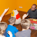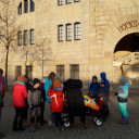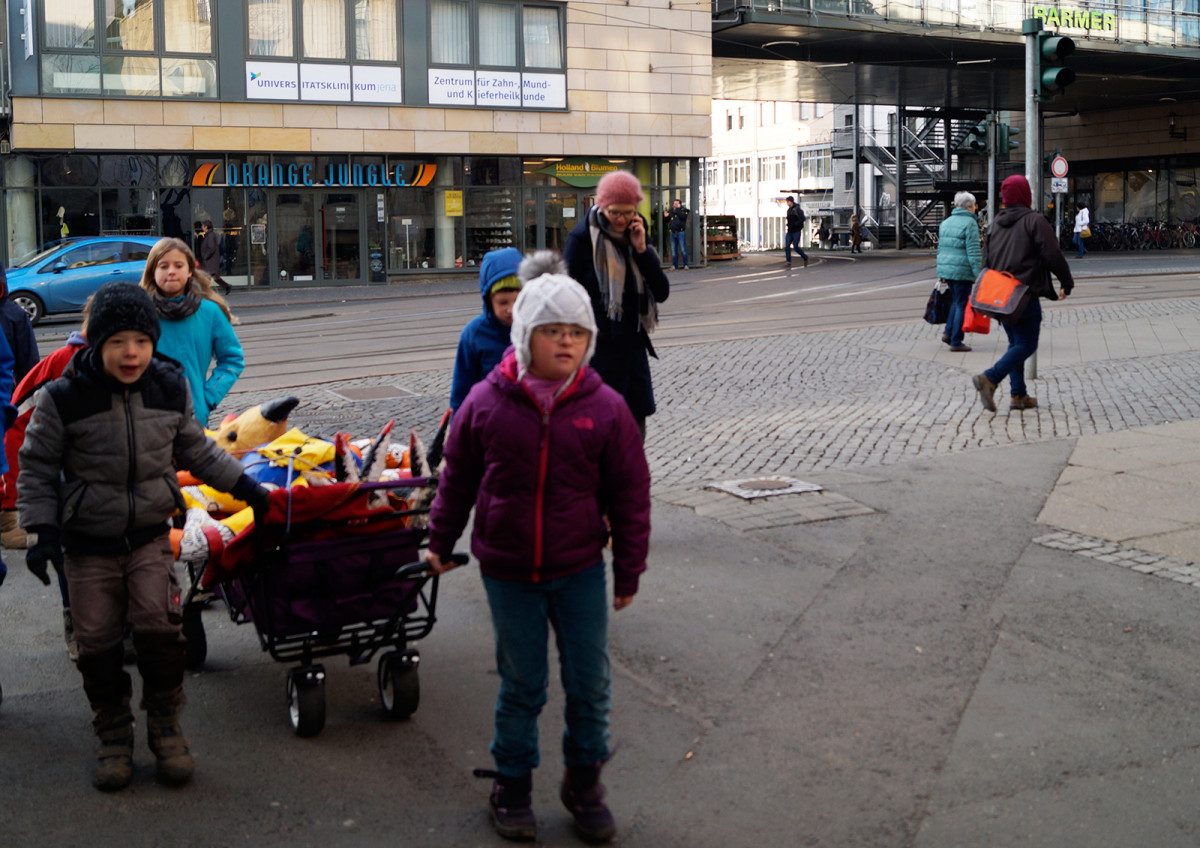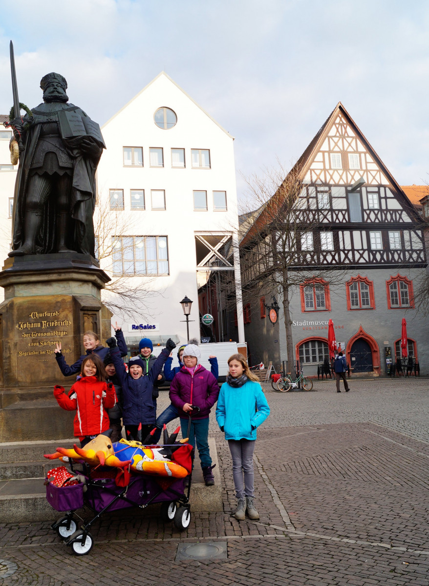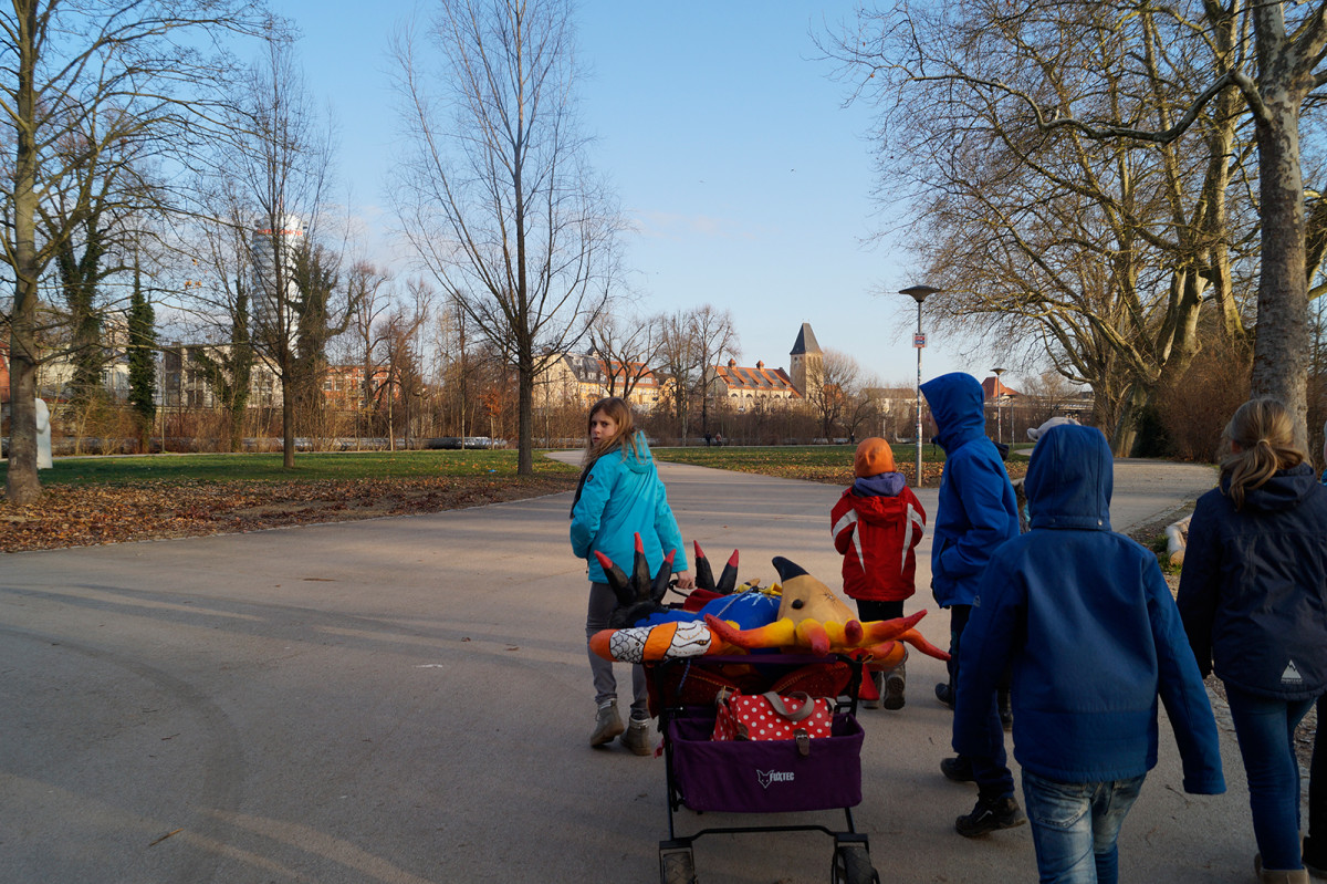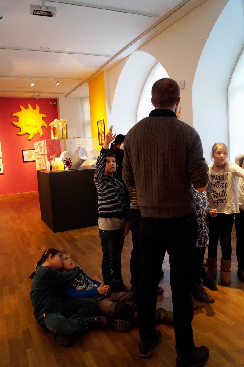 Am Montag dem 15. Januar zog der Phönix, entstanden im Kreativprojekt ”Nikis Welt” mit den Tigeraugen und Achaten der Freien Ganztagsgrundschule SteinMalEins, um in die Kunstsammlung des Stadtmuseums. Bei strahlendem Sonnenschein wurde er auf den Bollerwagen geschnallt und von den Schüler_innen stolz durchs Paradies bis ins Stadtmuseum gezogen. Dort fand er einen würdigen Platz am Eingang zur Wechselausstellung “Niki de Saint Phalle und das Theater”, die noch bis April in Jena ist. Nachdem der Phönix seinen Platz gefunden hatte, schaute Herr Land von der Kunstsammlung unterstützt vom kleinen Farbmonster mit den Schüler_innen „hinter die Kulissen“ und sie entdeckten und erforschten die knallig-bunte Theaterwelt der französischen Künstlerin. Die Schüler_innen waren eifrig dabei und löcherten ihn mit vielen offenen Fragen zu einer starken Frau in der Zeit der 1960er-Jahren. Wir freuen uns über die sehr bereichernde Kooperation mit dem Stadtmuseum und der Kunstsammlung Jena. Diese emöglicht den Schüler_innen einen altersgerechten Zugang zu anspruchsvollen Themen. Jedem der die Ausstellung besucht, wird nun der Phönix der SteinMalEins entgegenlächeln. Ein wunderbares Projekt geht mit dieser Übergabe zu Ende. Wir danken von Herzen Julia Kehmann, Museumspädagogin die uns in partnerschaftlicher Zusammenarbeit unterstützte.