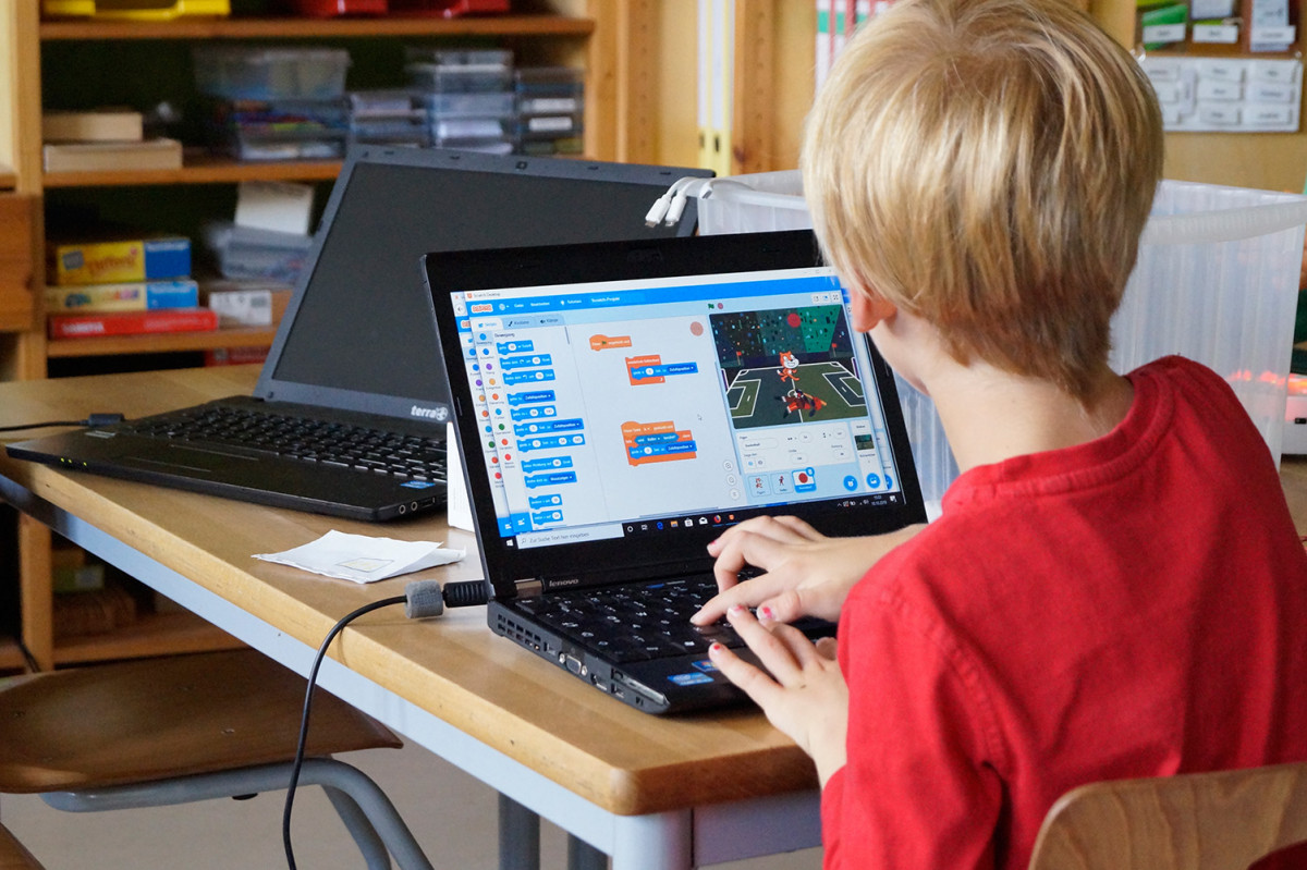 Am 10. Oktober konnten dann Erst- bis Viertklässler*innen in die Grundlagen der Computerspielprogrammierung reinschnuppern. Dafür stand ihnen Scratch und Scratch Junior, eine grafische Programmiersprache, zur Verfügung mit denen die Schüler*innen zum Beispiel auf einem Raster Blöcke zu Stapeln zusammen schieben oder Hintergründe und Grafiken zusammenfügen konnten, um sich so einfache Spielewelten zu kreieren. Einige Kinder übten bei „Minecraft“ 3D-Welten zu bauen und auch die kleinen Thymio-Roboter kamen wieder zum Einsatz. 23 Schüler*innen nutzten das Angebot, das einmal vormittags und einmal nachmittags zur Verfügung stand, begeistert – für die meisten der erste Kontakt mit der Welt der Programmierung. Alleine und in kleinen Gruppen wurde getüftelt und ausprobiert, sich gegenseitig stolz Ergebnisse präsentiert und über die Schulter geschaut – fast wie die Großen bei einem Hackathon*.