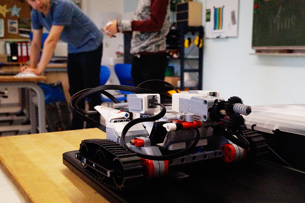 12 Gesamtschüler*innen konnten am Mittwoch dem 9.10. beim Workshop „Robotik“ in jeweils 2 Gruppen erleben, wie man den humanoiden Roboter Nao zum Sprechen bringt. Denn die speziell für den Roboter entwickelte, grafische Oberfläche ermöglicht durch das Aneinanderreihen von “Bausteinen” das Steuern des Roboters ohne Programmierkenntnisse. Mittels eines Entwicklungs-Tools konnten die Schülerinnen die Motoren des Roboters bewegen und Sätze beibringen. Zum Einsatz kamen auch die kleinen Thymio-Roboter, die zwar nicht sprechen können wie Nao, aber mobil sind und 6 verschiedene Stimmungs-Modi mit Lichteffekten kennen. Dank verschiedener Sensoren fahren diese kleinen Technikwesen selbstständig, folgen anderen Robotern, weichen Hindernissen aus oder reagieren auf Geräusche. In den Workshop waren einige Schüler*innen, die bereits in den schuleigenen AGs mit Jean-Philipp tüfteln und Roboter programmieren, aber auch viele, für die Robotik etwas ganz Neues war und in Zukunft vielleicht weiterverfolgen.