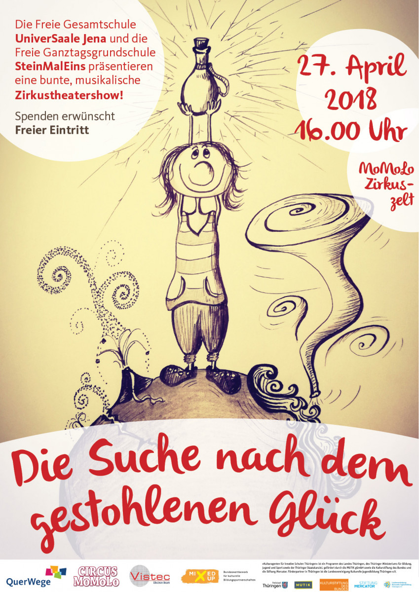 Wer sich mit fröhlichen Clowns auf eine abenteuerliche Reise ins Reich der bösen Hexen begeben möchte, um die geraubten Phantasien und Freude der Kinder zurück zu erobern, sollte unbedingt bei dieser fantastischen Show im MoMoLo Zirkuszelt am 27. April dabei sein! Mit Artistik, Jonglage, Trampolineinlagen und viel Spaß & Freude bieten die Clowns im Stück “Die Suche nach dem gestohlenen Glück” den Hexen Paroli, die durch die gestohlenen Fähigkeiten der Kinder die Macht über die Menschen erlangen wollen. Knapp 60 Schüler_innen, im Alter von 7–15 Jahren, haben an diesem Stück zusammen gearbeitet. Zwei Zirkus-AGs beider Schulen, die Schüler_innen der UniverSaale-Werkstatt “Tuch und Trampolin” sowie des Wahlpflichtfachs “Darstellen und Gestalten” haben im Verlauf des Schuljahres verschiedene Zirkus-Disziplinen erprobt und ihr Können dann bei gemeinsamen Proben für den finalen Auftritt vereint. Beteiligt an der gemeinsamen Show wird auch die UniverSaale-AG “Zeichnen” sein, welche die Maske übernimmt. Musikalisch begleitet wird der Auftritt von der UniverSaale-Schulband.
