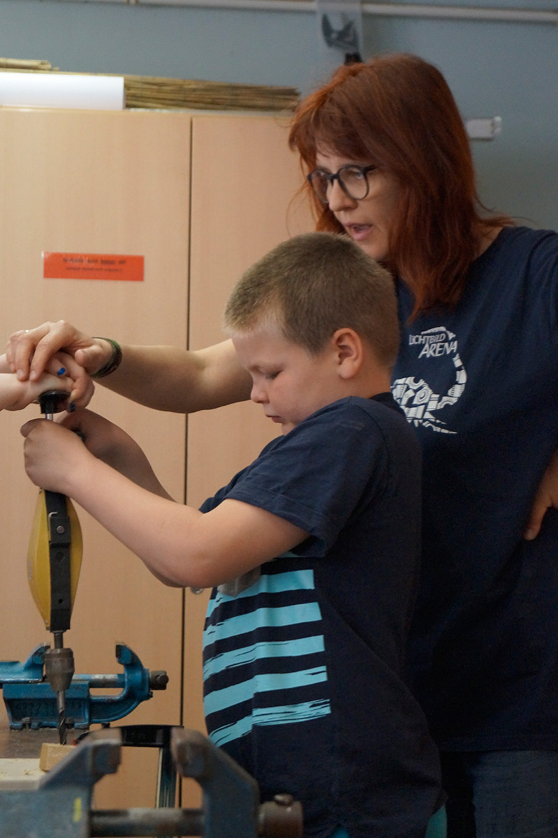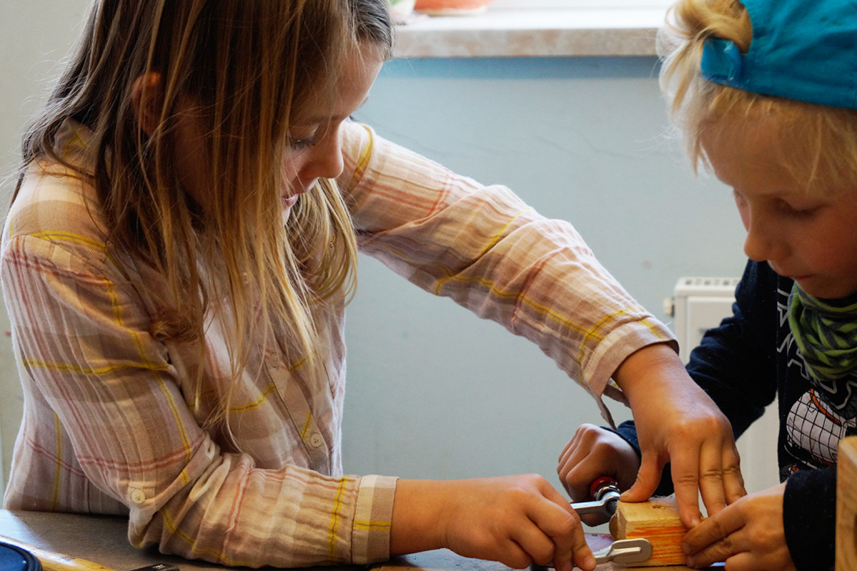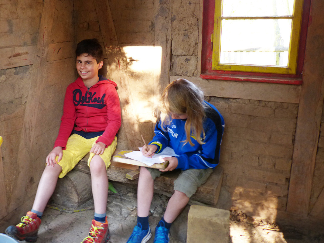 - Was habt ihr schon gemacht? Wir haben in der Holzwerkstatt Wasserräder gebaut. Es klappt nicht gut am Bach weil zu wenig Strömung ist.