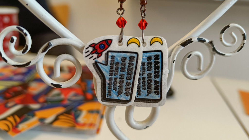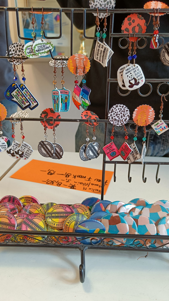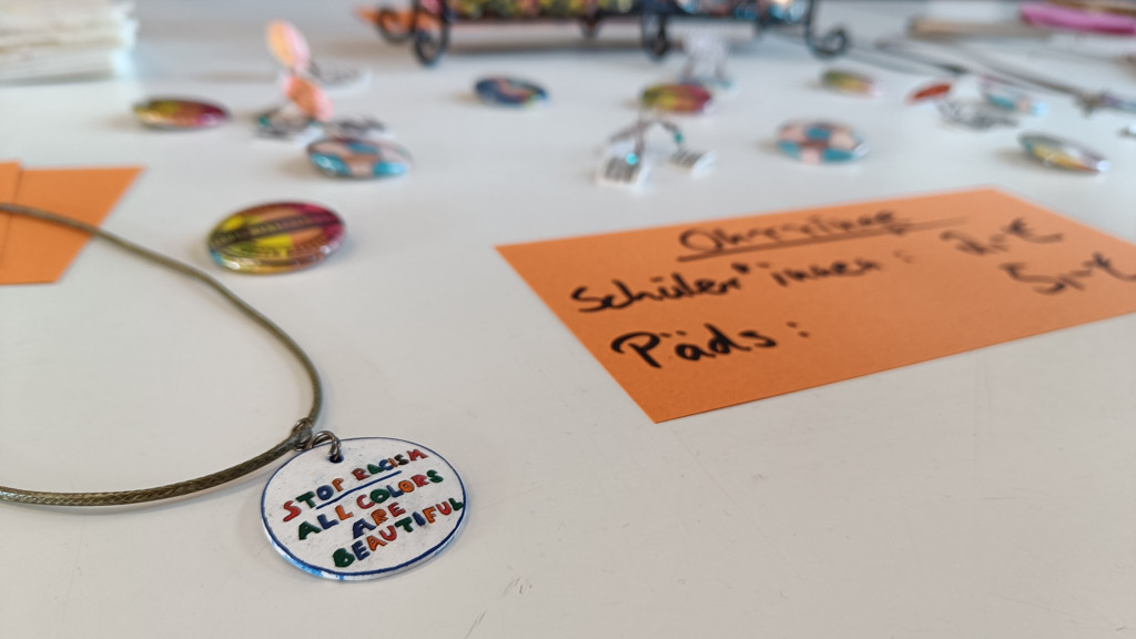 Beim Aktionsstand im Foyer kamen vor allem die selbstgebastelten Ohrringe und Anhänger sehr gut an. Dank Schrumpffolie wurden nämlich antirassistische Sprüche, Motive für Toleranz und Menschenrechte sowie bunte Slogans von den Schüler*innen in einzigartige Schmuckstücke verwandelt. 219€ an Spende konnten die Schüler*innen mit dieser Aktion einsammeln!