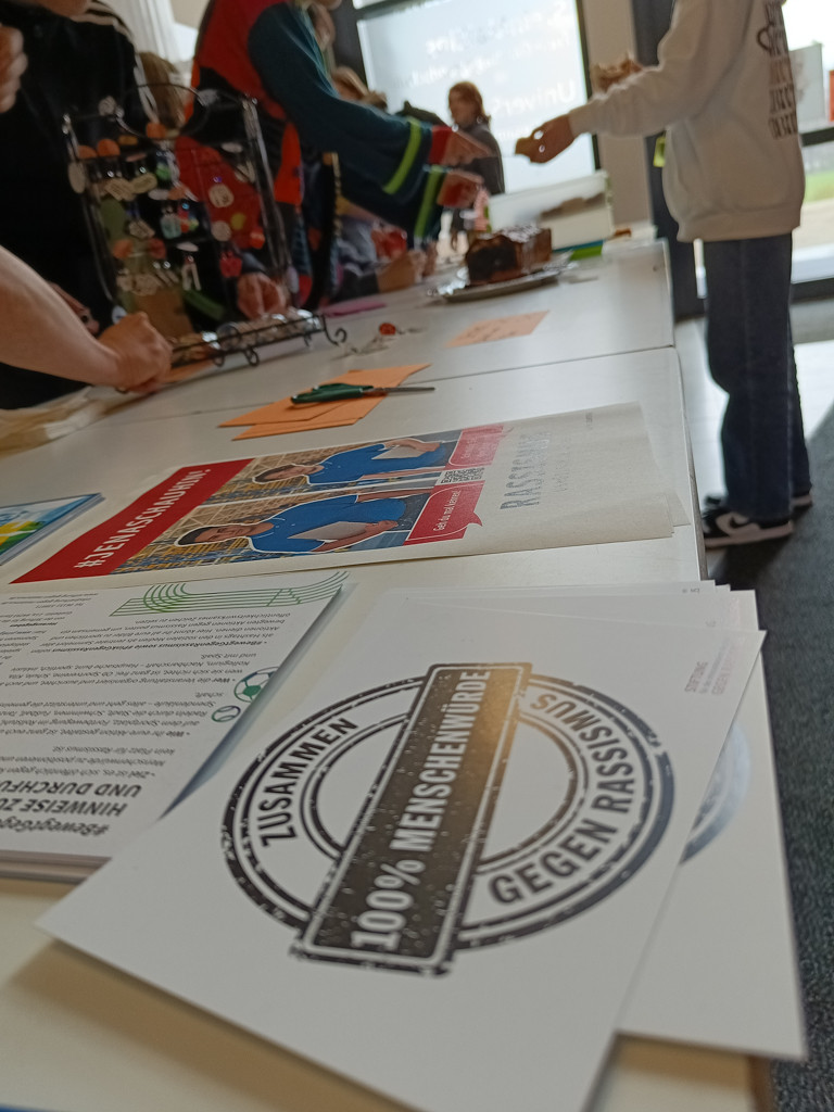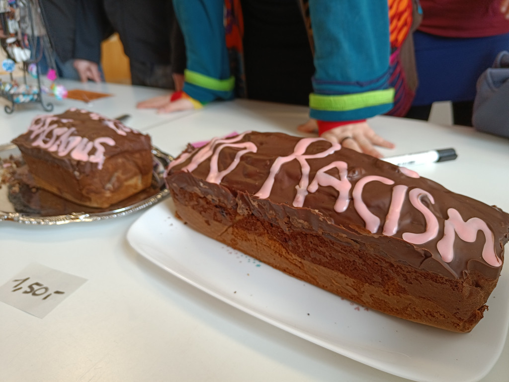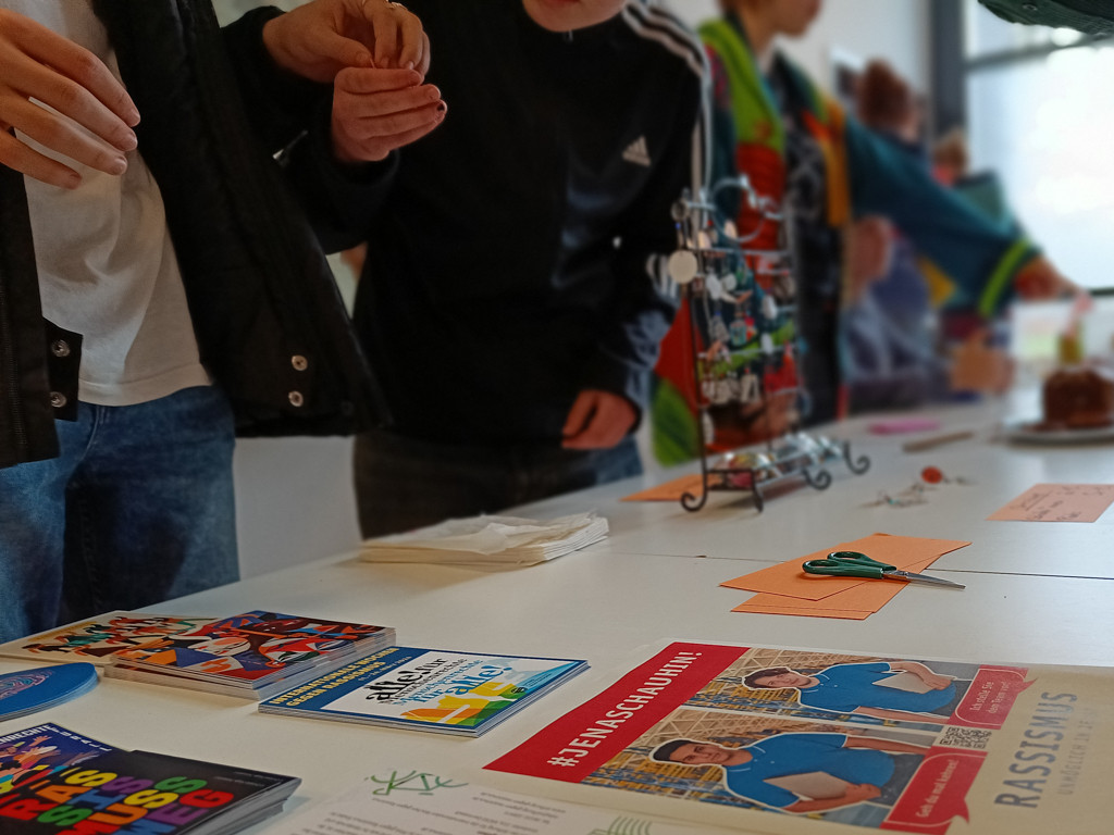 Während der »Internationalen Wochen gegen Rassismus« und punktgenau am »Internationalen Tag gegen Rassismus«, dem 21.3., hat die Demokratie AG im Foyer der UniverSaale einen Basar veranstaltet, um über Themen wie Rassismus, Fremdenfeindlichkeit, Toleranz und Gerechtigkeit zu sprechen, Informationsmaterialien zu verteilen sowie leckeren Kuchen und selbst gebastelten Schmuck anzubieten. Dadurch sammelten sie Spenden, die sie dem Jenaer Frauenhaus e.V. übergeben wollen.