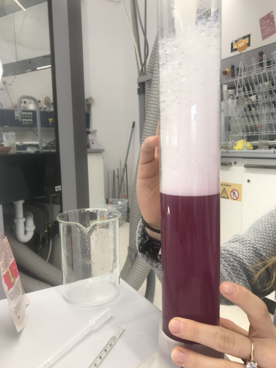 Nachdem sich die Schüler_innen des Chemiekurses in Jahrgang 13 in vielen Projekten umfangreiches Fachwissen angeeignet haben, reflektierten sie im letzten Chemieprojekt Methoden des naturwissenschaftlichen Erkenntnisgewinns. Als Forschungsgegenstand wurde die Frage nach dem Badezusatz, der den besten und beständigsten Schaum bildet, gewählt. Sie entwickelten einen Versuchsablauf, in dem 7 Badezusätze “Stiftung-Warentest-like” untersucht wurden. Die gewonnenen Daten wurden wissenschaftlich erhoben, ausgewertet und präsentiert. Nach 3 stündigen Untersuchungen kann die Wahl des besten Badezusatzes nun wissenschaftlich fundiert getroffen werden. ;-) Testergebnisse können bei den Chemieschüler_innen erfragt werden.