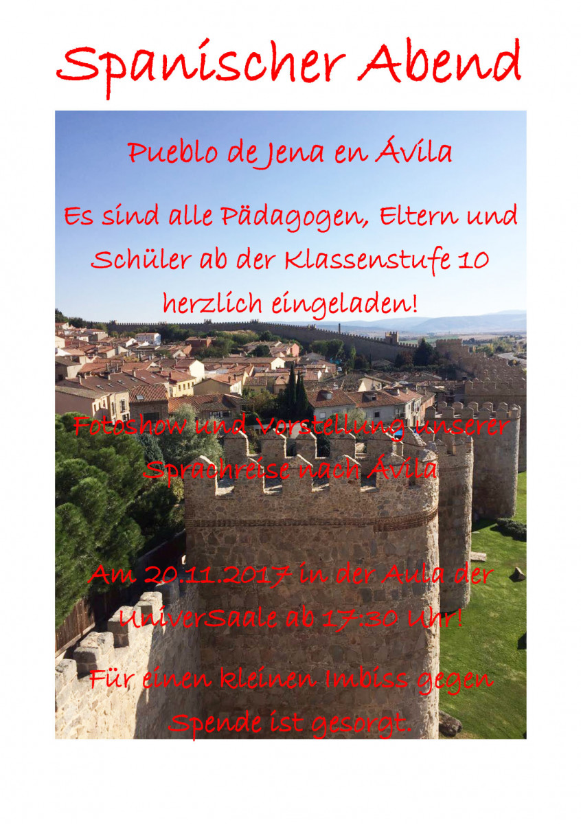 Die Schüler_innen der UniverSaale laden herzlich alle interessierten Pädagog_innen, Eltern und Schüler_innen ab Jahrgang 10 ein, um sich über die vergangene Sprachreise nach Spanien zu informieren. Es gibt eine Fotoshow und ein leckeres spanisches Buffet auf Spendenbasis. Los geht es um 17.30 Uhr in der Aula der UniverSaale (Burgauer Weg 1a).