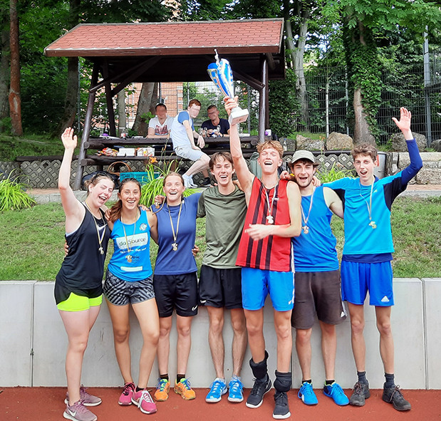 Als aktueller Titelträger trat unsere UniverSaale-Mannschaft am 12. Juli zum 29. IGS-Schulturnier im Volleyball an. Das erklärte Ziel war es, den mitgebrachten Pokal direkt wieder mit ins Paradies zu nehmen. Das dies kein Spaziergang werden würde, zeigte sich beim Blick aufs Teilnehmerfeld, in dem vor allem die erste Mannschaft des Otto-Schott-Gymnasiums einige Vereinsspieler*innen in sich vereinte. Nach einer souveränen Vorrunde, welche man als erster der Vierergruppe abschloss, kam es im Halbfinale zum Duell mit der Montessori-Schule. Und auch hier konnten wir einen deutlichen Sieg einfahren. Somit kam es zum erwarteten Finale gegen das Otto-Schott-Gymnasium. Hier entwickelte sich nach klar gewonnenem ersten Satz ein echter Krimi im zweiten. Welcher nach frenetischer Anfeuerung durch Betreuer und Mannschaftskamerad*innen mit 16:14 gewonnen wurde. Der Rest war großer Jubel!!! Titelverteidung perfekt, auf zum Triple nächstes Jahr. Vielen Dank an die Spieler Luca und Lena Frank, Karl Pawlick, Elisa Huth, Patricia Ehms, Sebastian Lorenz und Benedikt Palitza sowie dem Betreuer Florian Ludwig!!! Let’s go UniverSaale!