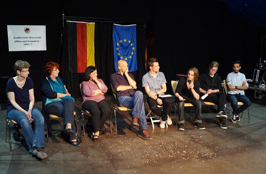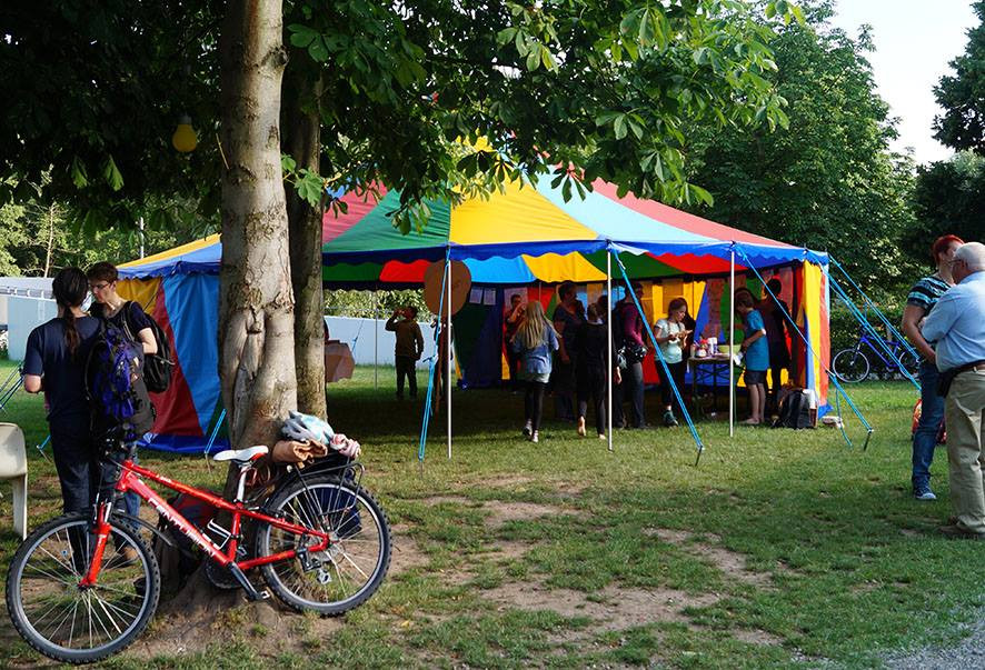 Die Titelverleihung war eingebettet in die »Aktion Bunte Vielfalt« der UniverSaale. Auf dem Gelände des Circus MoMoLo fand gestern in diesem Rahmen auch die Premiere des Stücks »Mein Land« statt, welches Schüler_innen des 7.-10. Jahrgangs geschrieben und auf die Bühne gebracht haben. Das Stück basiert auf den Erlebnissen eines syrischen Flüchtlings, der den Schüler_innen im Rahmen des Projekts »Asyl und Migration« von seinem Ankommen in Deutschland berichtet hat. Im Anschluss an die Premiere, die bei den über 100 Zuschauern für großes Lob sorgte, gab es eine Podiumsdiskussion zur Situation von Flüchtlingen in Jena. Hier kamen u.a. Menschen mit Fluchterfahrungen zu Wort, ebenso wie Dörthe Thiele (Beauftragte für Migration und Integration der Stadt Jena), Barbara Wrede (Schulleiterin der Lobdeburgschule) und Jannik Palm (Asyl e.V. Jena). Abgerundet wurde die »Aktion Bunte Vielfalt« durch Infostände der UniverSaale-AG´s »Aktiv gegen Nazis« und »Asyl« und die Comicausstellung »Fluchtgeschichten«.