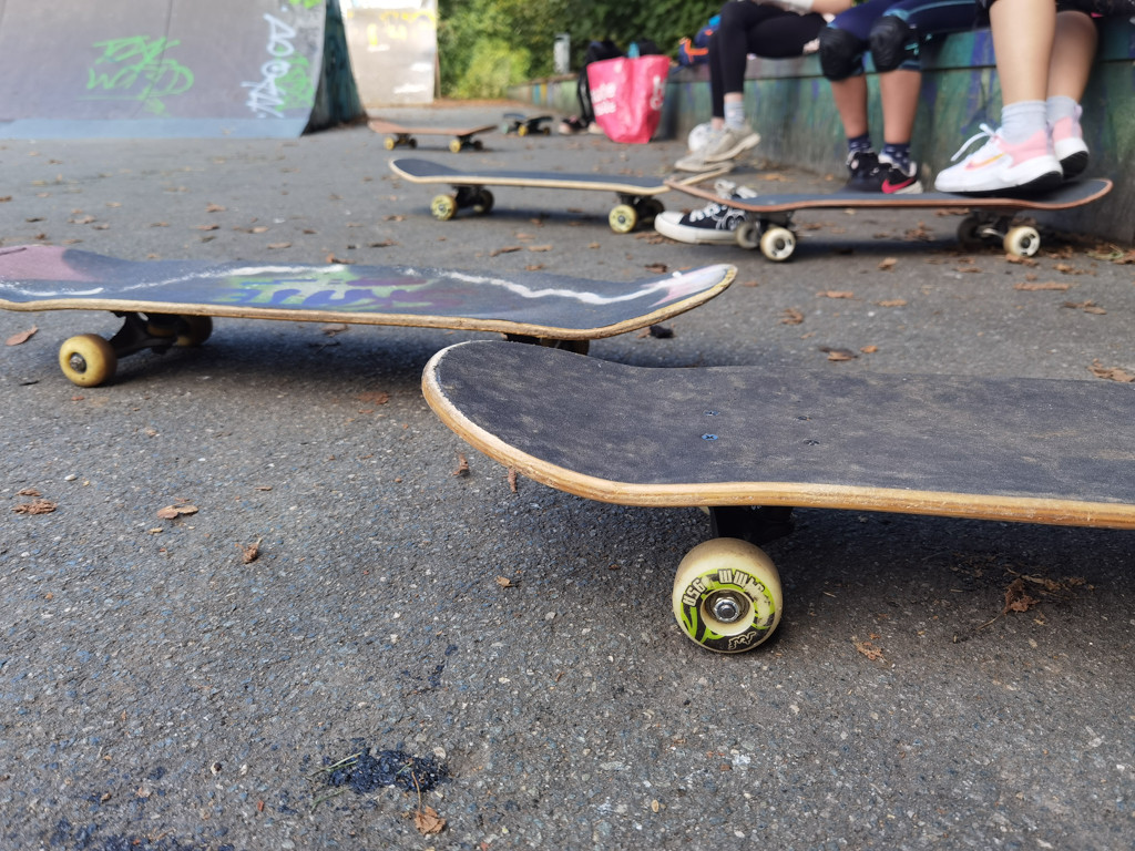 Zusammen dem Thüringer Roll.Laden e.V. hat die UniverSaale im September ein Sportprojekt auf die Beine, genauer gesagt Rollen gestellt. Jeweils drei Tage lang konnten sich verschiedene Stammgruppen der Jahrgänge 5/6 und 7/8 auf dem Skatepark im Paradies beim Skateboardfahren ausprobieren. Viele der Schüler*innen waren mit dieser Sportart noch wenig vertraut, auch wenn sie sich mit Rollen bereits durch ihre Scooter oder Inlineskates auskannten. Aber auf einem zuerst mal wackeligen Rollbrett zu stehen und die Balance im fahrenden Zustand zu finden, war für viele eine Überwindung, berichtete Luca, der zusammen mit Tim vom Rolladen e.V. die Kids anleitete. Doch nachdem die Schüler*innen schnell Zutrauen ins Skateboard und ihre eigenen Fähigkeiten gefasst hatten, konnte der Unterricht der etwas andere Art dann richtig beginnen: Auf dem Programm standen Fahren lernen, Lenken, Drehen und einige Einsteigertricks. »Koordination, ein gutes Boardgefühl und Mut« sind die wichtigsten Dinge, die man für Skateboardfahren braucht, so Luca. Danach kommt die Verfeinerung der Technik. Viele der Schüler*innen haben in den jeweils 9 Stunden, die jede Stammgruppe in diesem Sportprojekt zur Verfügung hatte, Feuer gefangen und einige sogar eine neue Leidenschaft entdeckt.
