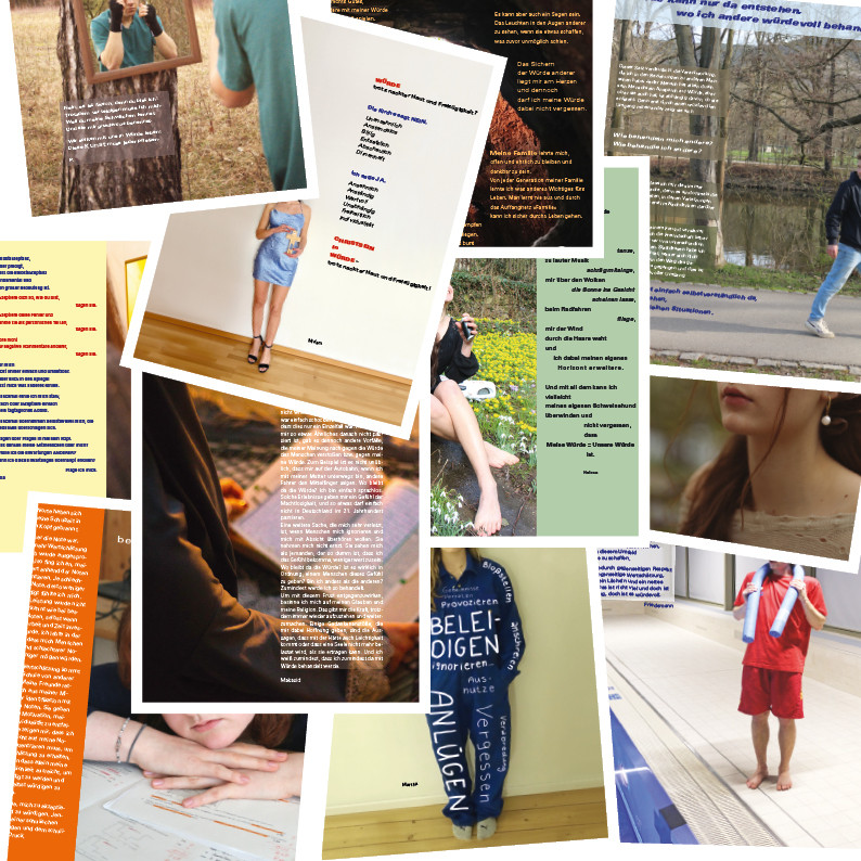 Neben inhaltlichen Impulsen ging es damit v.a. um die Reflektion des eigenen Selbstbildes der 12er und 13er und ihre ganz individuellen Formulierungen. Im Verlauf des Workshops wurden die Jugendlichen nicht nur dazu ermutigt, Erfahrungen zu reflektieren, in denen die eigen Würde oder die der Mitmenschen unbeachtet blieb und entsprechende Veränderungsmöglichkeiten zu erkunden, sondern auch, diese inneren Prozesse künstlerisch auszudrücken. Der kunstbildende Aspekt beinhaltete die Auseinandersetzung mit verschiedenen Gestaltungselementen, darunter Farben, Formen und Kompositionen, um eine tiefgreifende und individuelle Darstellung der persönlichen Würde zu schaffen, mit Abstand zu verbaler Ver-Intellektualisierung, hin zur aktiven Gestaltung und Bildung des Selbst. So entstanden berührende und sehr individuelle fotografische Selbstportraits. Diese sollen auf großformatige Platten gedruckt und in einer Ausstellung in der Aula im neuen Schuljahr präsentiert werden.