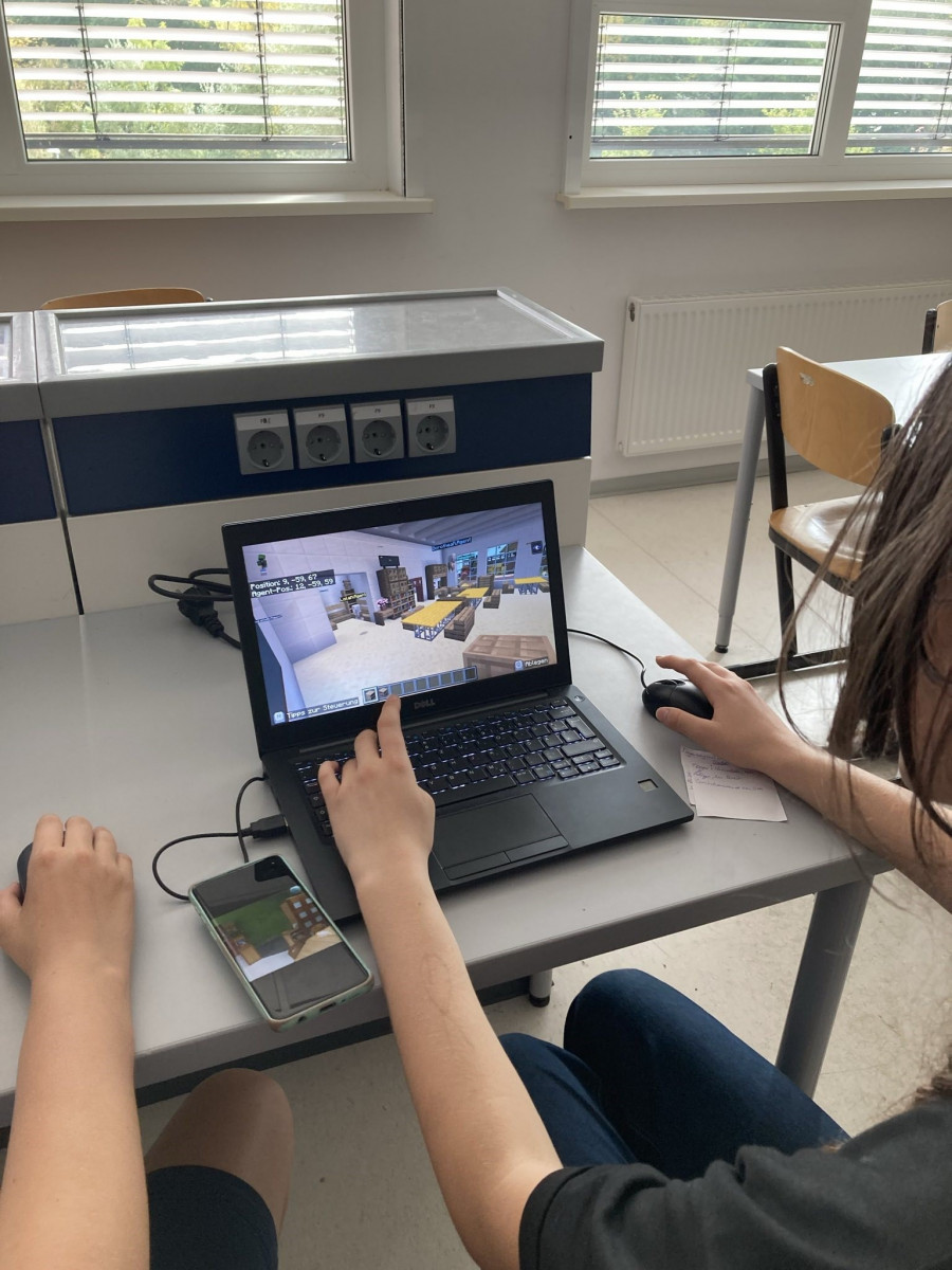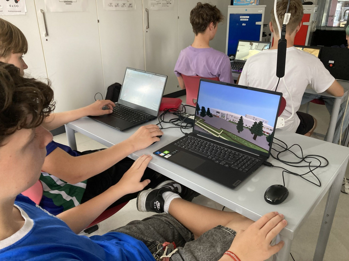 Im wahrscheinlich größten Workshop – mit 29 Schülerinnen und Schülern! – wird Minecraft nicht nur ausprobiert, nein, vielmehr wird unsere Schule nachgebaut und begehbar gemacht. Dabei wird das Programmieren und das Nutzen der Tools erprobt. Zum Tag der offenen Tür am Freitag können so die UniverSaale, aber auch unsere Grundschule SteinXEins, von allen Interessierten »bespielt« werden.