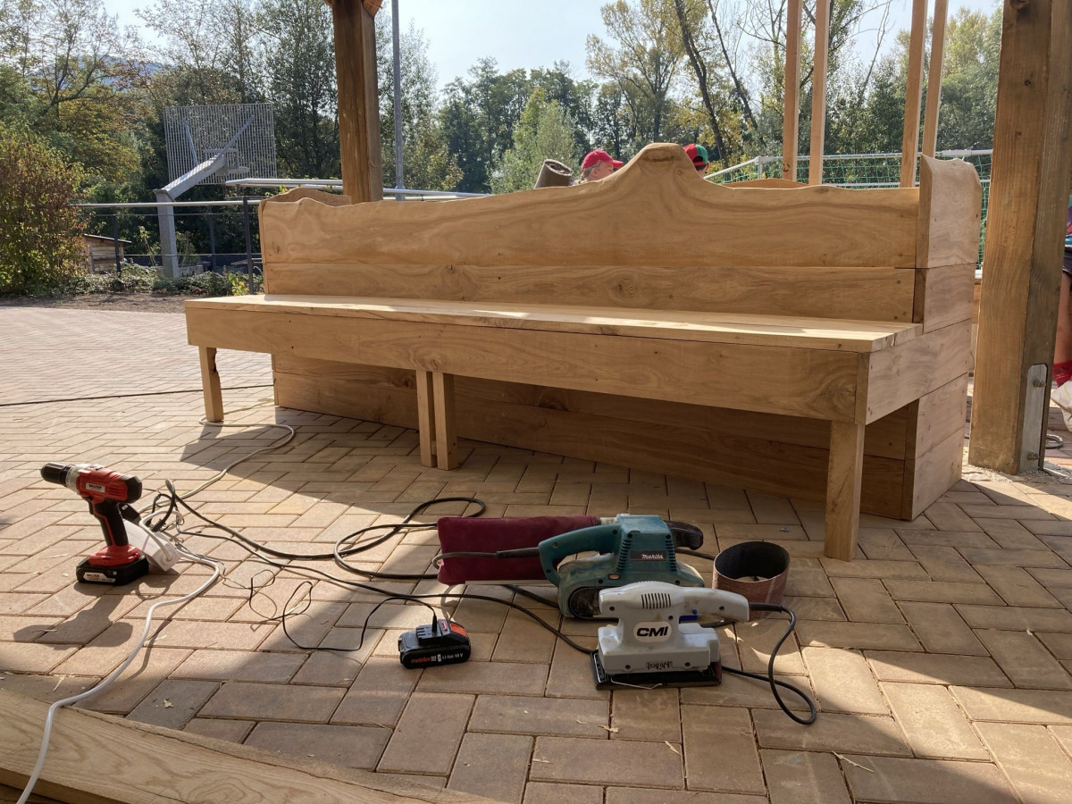 Unser Schulhof soll grüner werden und mehr Sitzplätze bekommen! Dieser Aufgabe hat sich eine Gruppe angenommen. Sie kauften dafür im Vorfeld eine schon gefällte Eiche und ließen sie von einem Vater in 4,80m lange Bretter zersägen, aus denen Kombinationen von Sitzgelegenheiten und Hochbeeten entstehen sollten. Im Internet fanden sich auf der Seite der »Initiative grüne Schulhöfe« aus Berlin kostenlose Bauanleitungen, die angepasst worden. Dank der großzügigen Spende von Eltern in der Höhe von unglaublichen 2.400€ (!) waren die Materialkosten gut zu decken. Die Gartenbaufirma Majonek spendete uns zudem Steine, Kies, Erde und Pflanzen. Die Schülerinnen und Schüler arbeiteten jeden Tag länger als bis zum Mittagessen – sie können nun Holz schleifen, sägen mit der Handkreissäge, Bohren und Schrauben. Das Ergebnis kann am Freitag auf dem Schulhof bewundert werden.