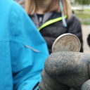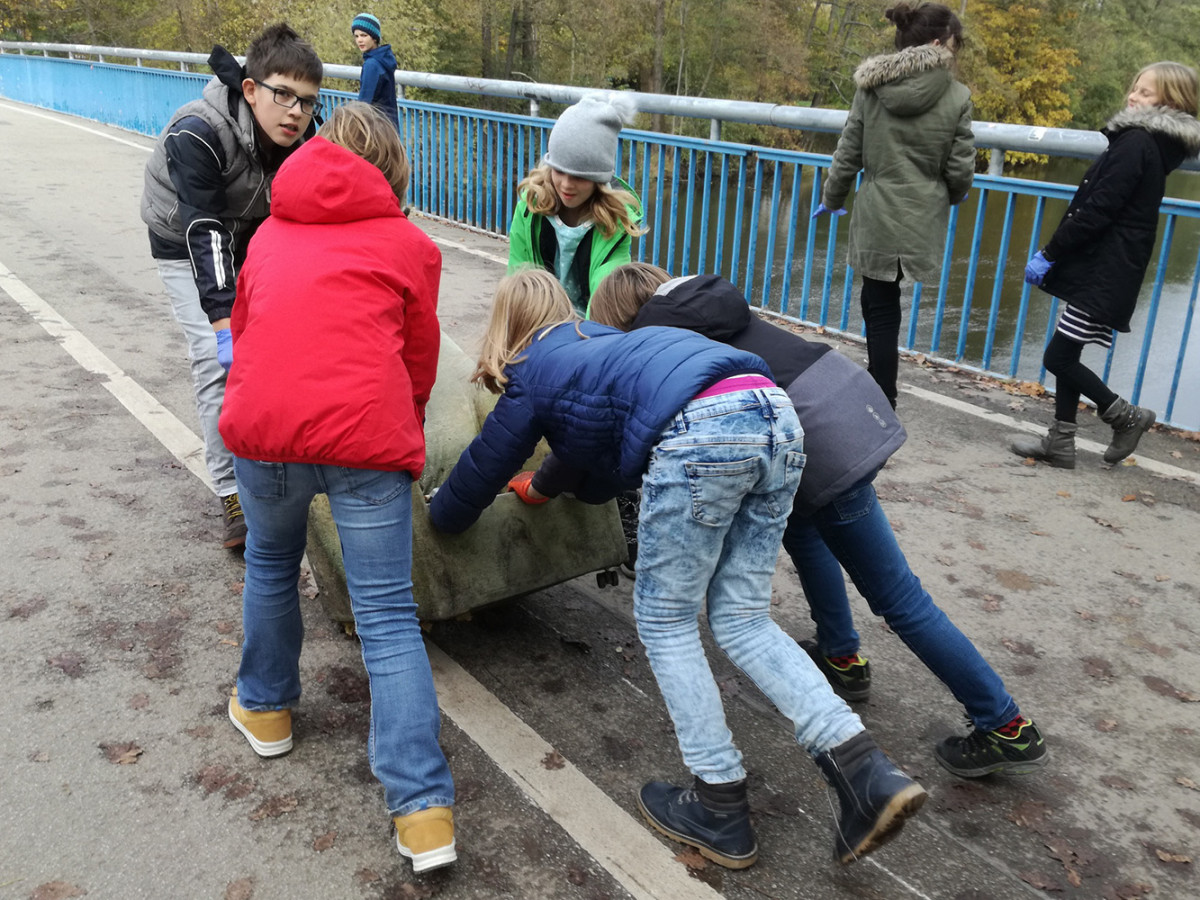 Zudem schulten die 5– und 6–Klässer*innen ihre Artenkenntnis vor Ort und gingen auf Exkursion ins Paradies. Sie entdeckten z.B. einen Graureiher in der Saale und verschiedene Fledermaus-Kästen. Bei diesem Rundgang durch den Park fiel den Schüler*innen die Verschmutzung des Saaleufers und des Teiches negativ ins Auge. Spontan entstand die Idee, Müll einzusammeln und so die Gefahren durch Glasscherben, Plastikflaschen, Tüten etc. für Tiere und Menschen zu reduzieren. In weniger als einer Stunde hatten die rund 20 Schüler*innen, ausgestattet mit Handschuhen und Greifern, zwei volle Müllsäcke zusammen. Sie waren erschrockiert darüber, wie viele Scherben von einer zerbrochenen Bierflasche in die Umwelt gelangen und dass Menschen sogar alte Sessel in die Natur schmeißen. Das Fundstück des Tages war übrigens ein 10–Pfennig-Stück aus DDR-Zeiten.