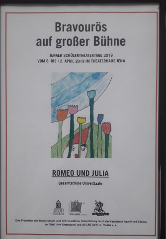 „WOW WOW WOW“ – So endete die Laudatio von Kerstin Lenhardt, der Leiterin des Jugendhauses am Theater Jena, zur Aufführung von „Romeo und Julia“ des DG-Kurses aus Jahrgang 8. Zum ersten Mal eroberte das Ensemble gemeinsam die große Bühne des Theaterhauses und durfte sich kräftig feiern lassen. Mit so viel Lob und positiven Stimmen hatte keiner der Darsteller_Innen gerechnet. Sie lieferten ein kurzweiliges, toll gespieltes und theatralisch anspruchsvolles Bühnenstück ab. Die gemeinsame Arbeit an diesem Stück war intensiv und nervenaufreibend, aber sie hat sich gelohnt. “Laut und deutlich sprechen, bühnenoffen spielen, Präsenz zeigen, in der Rolle bleiben, auf das Timing achten, ausspielen, im Lichtkegel stehen ….“ – unzählige nervige Ansagen mussten Alina, Cornelius, Franka, Jessy, Lasse, Lena, Miriam, Richard, Rebekka und Vicky beachten und nebenbei noch den Text behalten. Wie haben sie das nur geschafft? Knapp 2 Jahre DG-Unterricht haben sich ausgezahlt und alle sind über sich hinausgewachsen. Für diese unglaubliche Leistung gab es nicht nur lauten Applaus vom Publikum, sondern auch ein dickes Lob von ihrer DG-Lehrerin Maren Hädrich. Ein großes Dankeschön geht auch an Anne Niezijewski für die Mitarbeit an der Stückentwicklung und der herausfordernden Koordination von Licht und Ton während der Aufführung sowie an Rebekka aus Jahrgang 9 für die spontane und professionelle Unterstützung. Wir freuen uns schon auf Euer nächstes Stück!!!!!!!