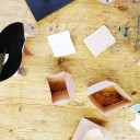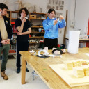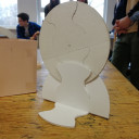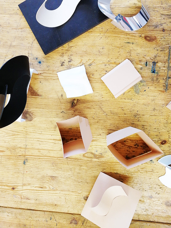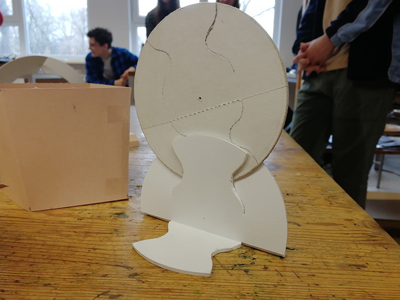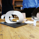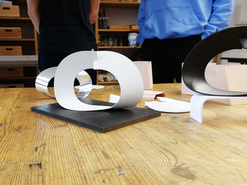 Auch die Metallbau-Werkstatt bekam Unterstützung von Robert Krainhöfner. Sie schätzen ebenfalls die offene Arbeitsatmosphäre in seiner Werkstatt, sein Fachwissen und die Möglichkeit mit verschiedenen Materialien zu arbeiten. In dieser Gruppe entstanden Modelle zu Metallskulpturen sowie ein praktisches Beispiel für einen Notizzettelhalter – hergestellt aus der Grundform eines Kreises und dank durchdachter Schnitte und Falzung ein cleverer Prototyp, der analog zum Bauhaus-Gedanken auch in Serie gehen könnte.