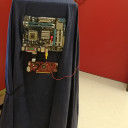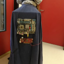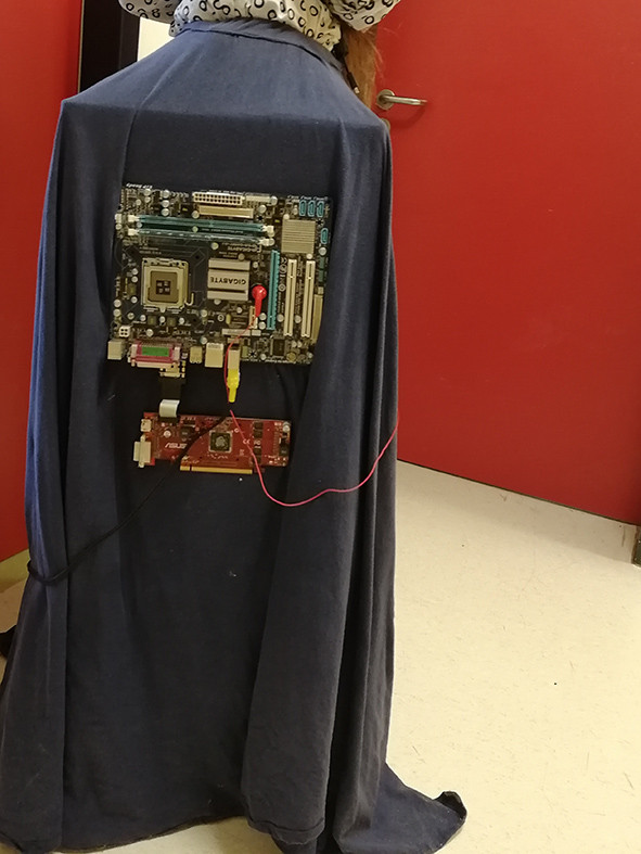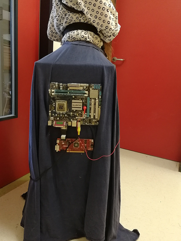 In der Bühnenwerkstatt entstanden im Verlauf des Halbjahres zwei Kostüm-Entwürfe, wovon ein Modell gezeigt wurde. Es handelte sich um ein originelles Kleidungsstück bestehend aus Bluse und eckigem Karton-Rock, das sich dem Thema „Welle“ aus technisch-physikalischer Sicht nähert. Die verwendeten Elemente bestehen aus recyceltem Technik-Müll, den KSJ zur Verfügung gestellt hat. Dargestellt ist das Stadtbild von Jena, inklusive Saale (die durch eine Lichterkette beleuchtet werden kann) und Zugangsstraßen. Eine Seite des Rocks wurde mit einer Leiterplatte versehen, welche die moderne Datenverarbeitung an unserer Schule symbolisieren soll. Eine andere Seite ziert eine ausrangierte Tastatur, die laut der Künstlerin für die besondere Kommunikation steht, die an unserer Schule mit ihrer sehr heterogenen Schülerschaft steht. Schmuckstücke wie Gürtel und Kabel an der Bluse runden das Kostüm, stimmig im technikkühlen Blau und Weiß gehalten, ab.