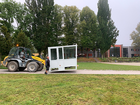 Doch zuerst musste das Teil mit Fingerspitzengefühl passgenau neben unsere zukünftige Büchertauschzelle an den Zaun des Schulhofs gesetzt werden – dank unserer Kollegen von der Haustechnik gelang uns der Volltreffer. Jubel und Erleichterung