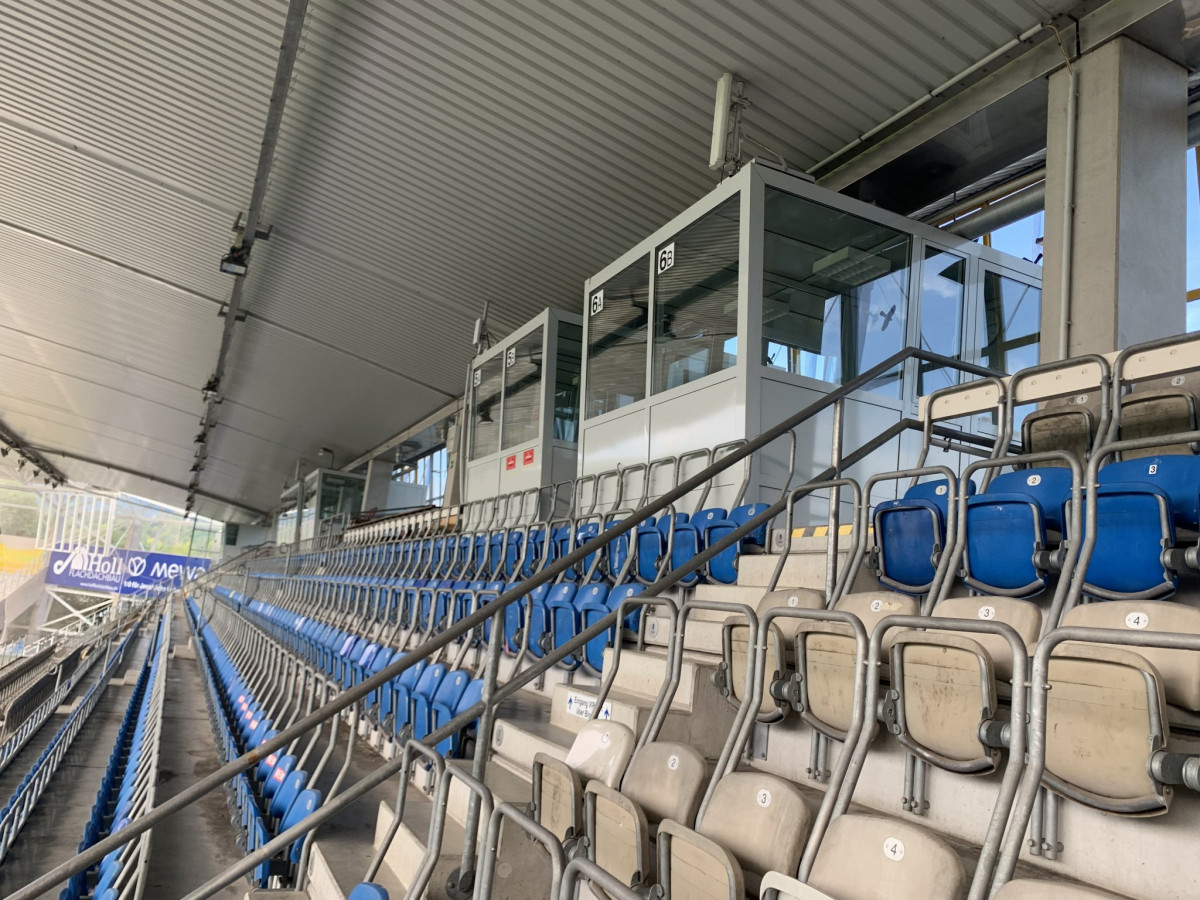 Die knapp 10qm große Kabine wurde im alten Stadion bei FCC-Spielen von Reportern, Sprechern und auch der Polizei genutzt. Unser Schuldirektor Wolfram Böhme saß früher höchstselbst darin und berichtete für den OKJ über Spielverläufe. Es ist daher eine Freude, dass die Kabine im 90er Retrocharme nun auf unserem Schulhof erhalten bleibt.