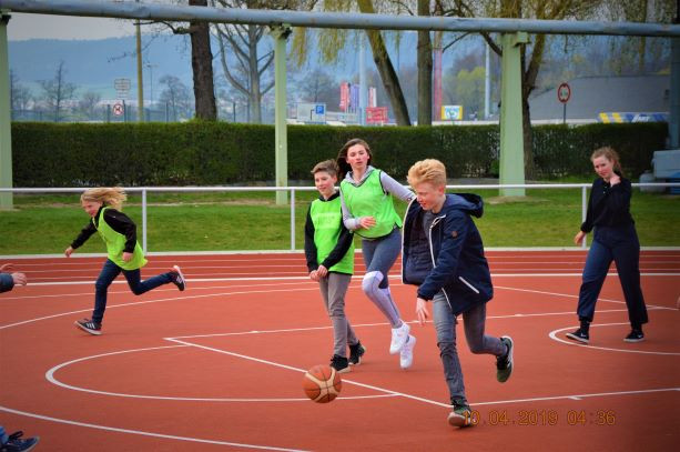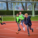Während diese und andere Gruppen kreativ arbeiteten, turnten andere Schüler_innen über das Sportfeld im USV-Gelände. Denn so wie auch in den vergangenen Tagen wurde von Alex und Basti Pausensport angeboten, um den rauchenden Köpfen eine Abwechslung zu verschaffen und dem Anspruch bewegter Schule gerecht zu werden.