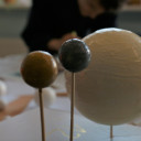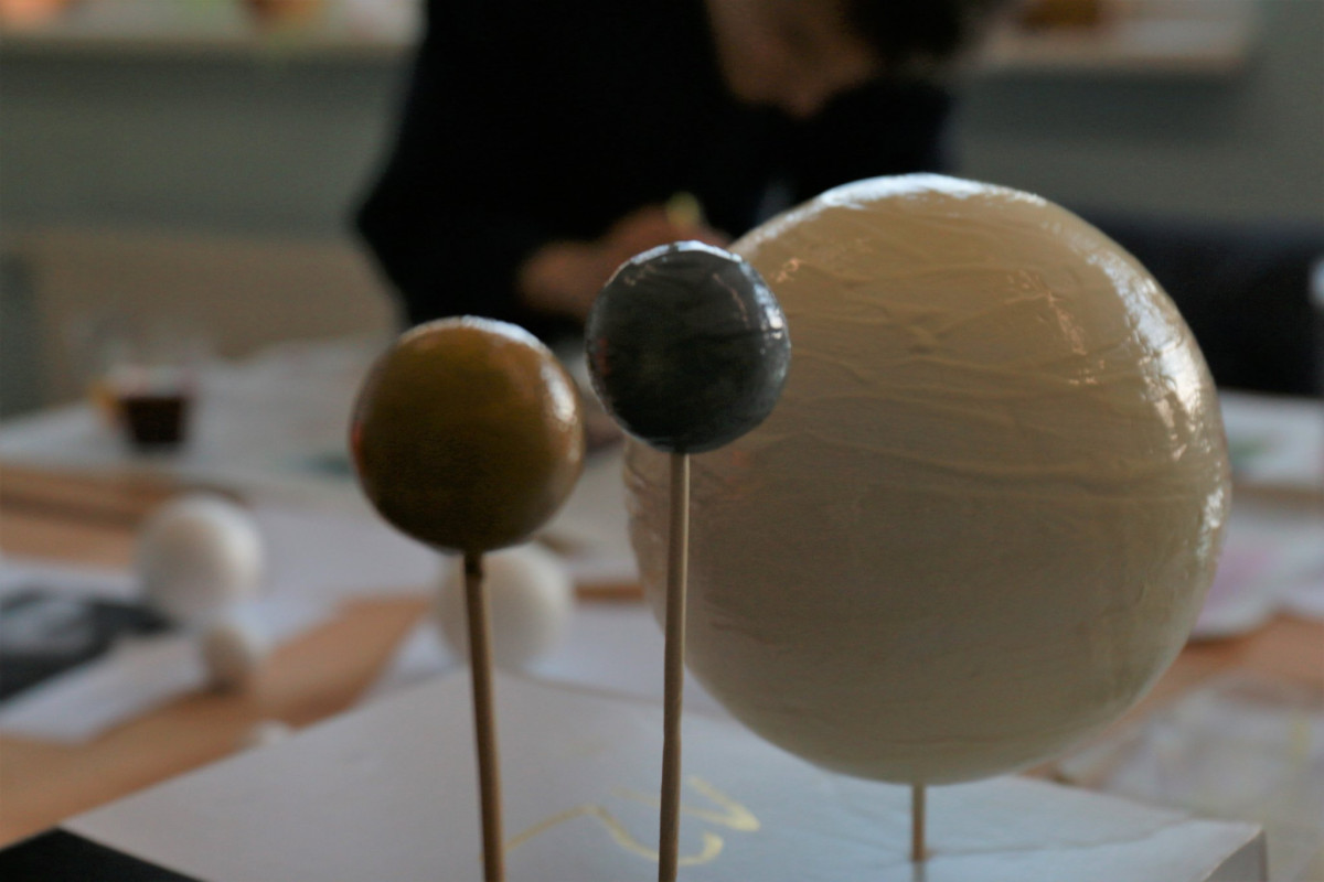 In den unendlichen Weiten des UniverSaale-Universums befindet sich auch ein Workshop, der sich mit dem Bau von Planetenmodellen beschäftigt. Dabei entstanden bisher drei verschiedene Darstellungen unseres Sonnensystems sowie eine kleinere Version des Jupiters mit den vier galileischen Monden. Die Modelle werden ab morgen im Schulhaus ausgestellt.